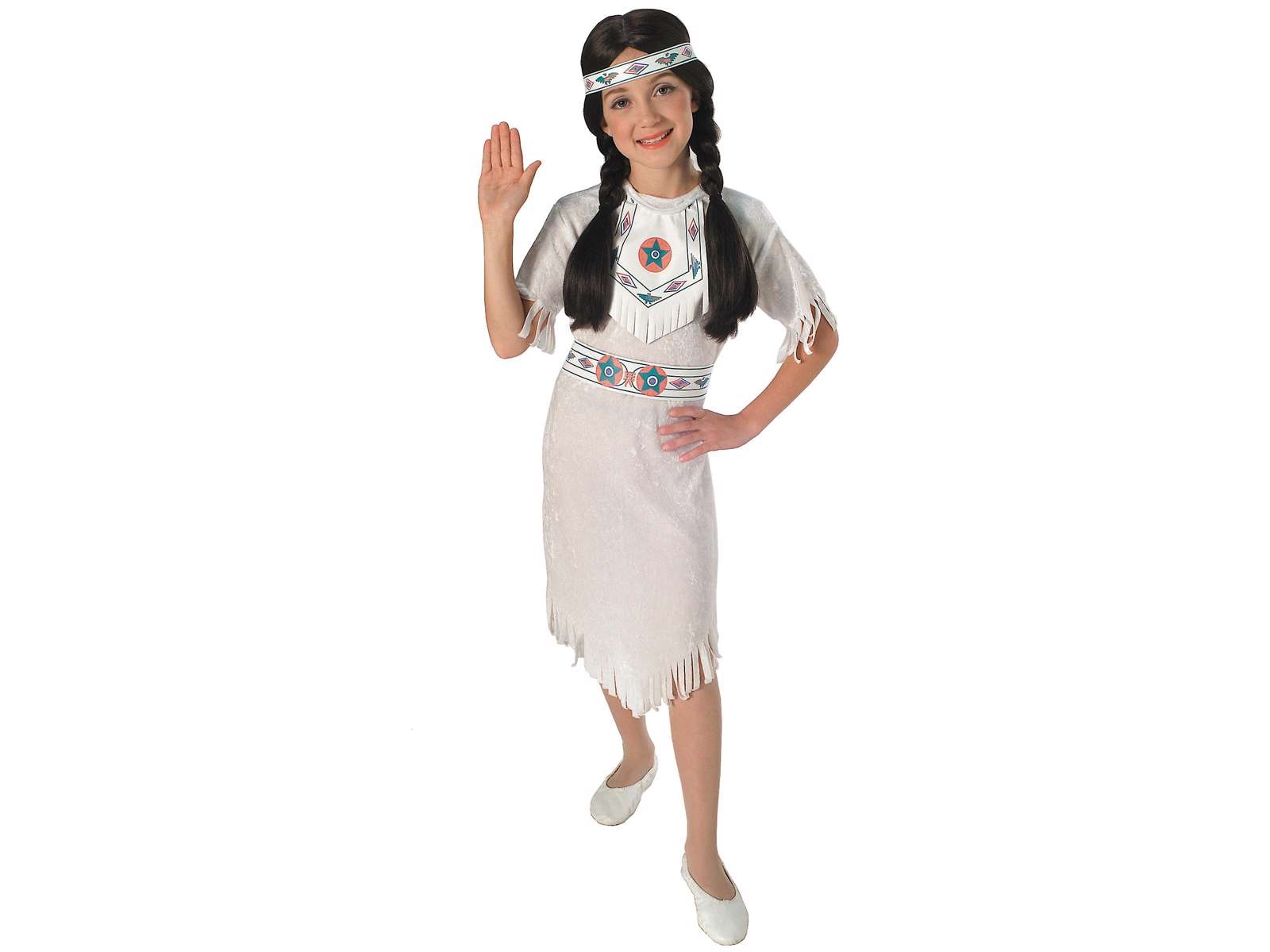 Sødt kostume til en lille indianer prinsesse. Passer til 3-4 årige. I sættet medfølger: Kjole, krave, bælte og pandebånd. Paryk medfølger ikke.
