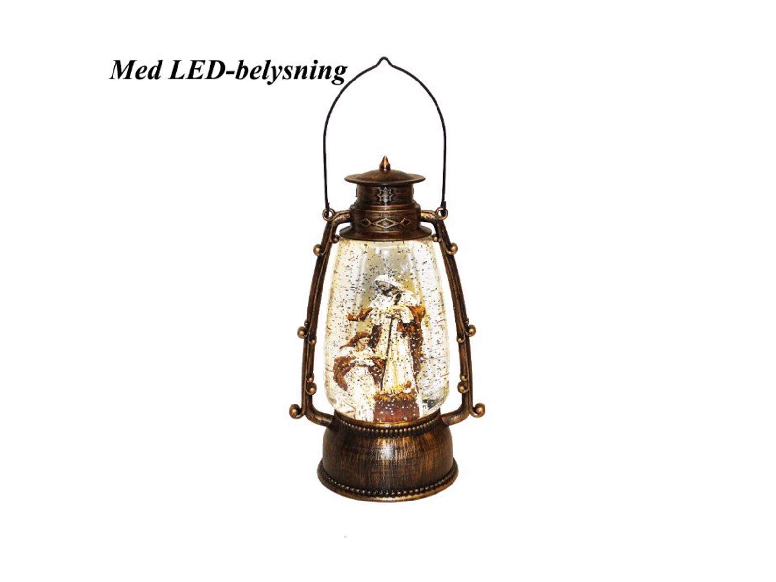 Flot lygte med Jomfru Maria, Josef og baby Jesus.