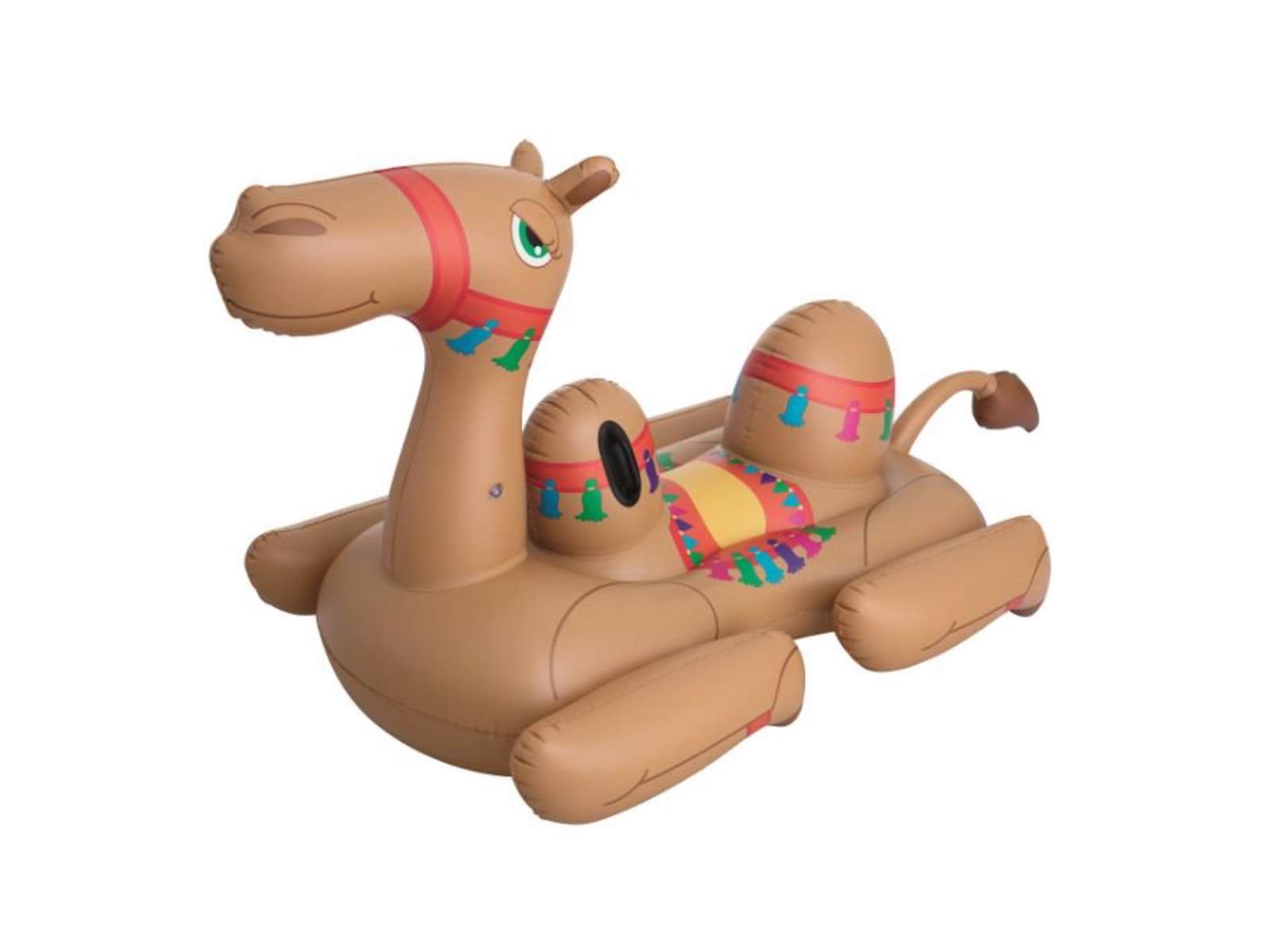 Stort badedyr, formet som en sjov kamel. Den måler 221 x 132 cm og er lavet i robust vinyl. Reparationslap medfølger Max vægt 90 kg.