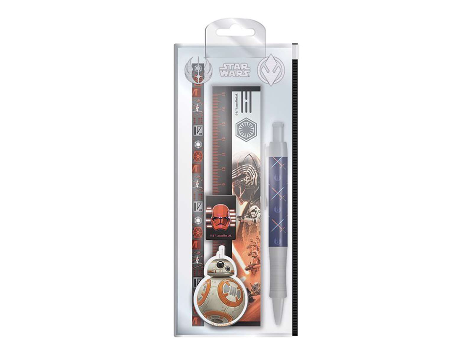 Skrivesæt fra Star Wars med blyant, lineal, kuglepen, blyantspidser og viskelæder.