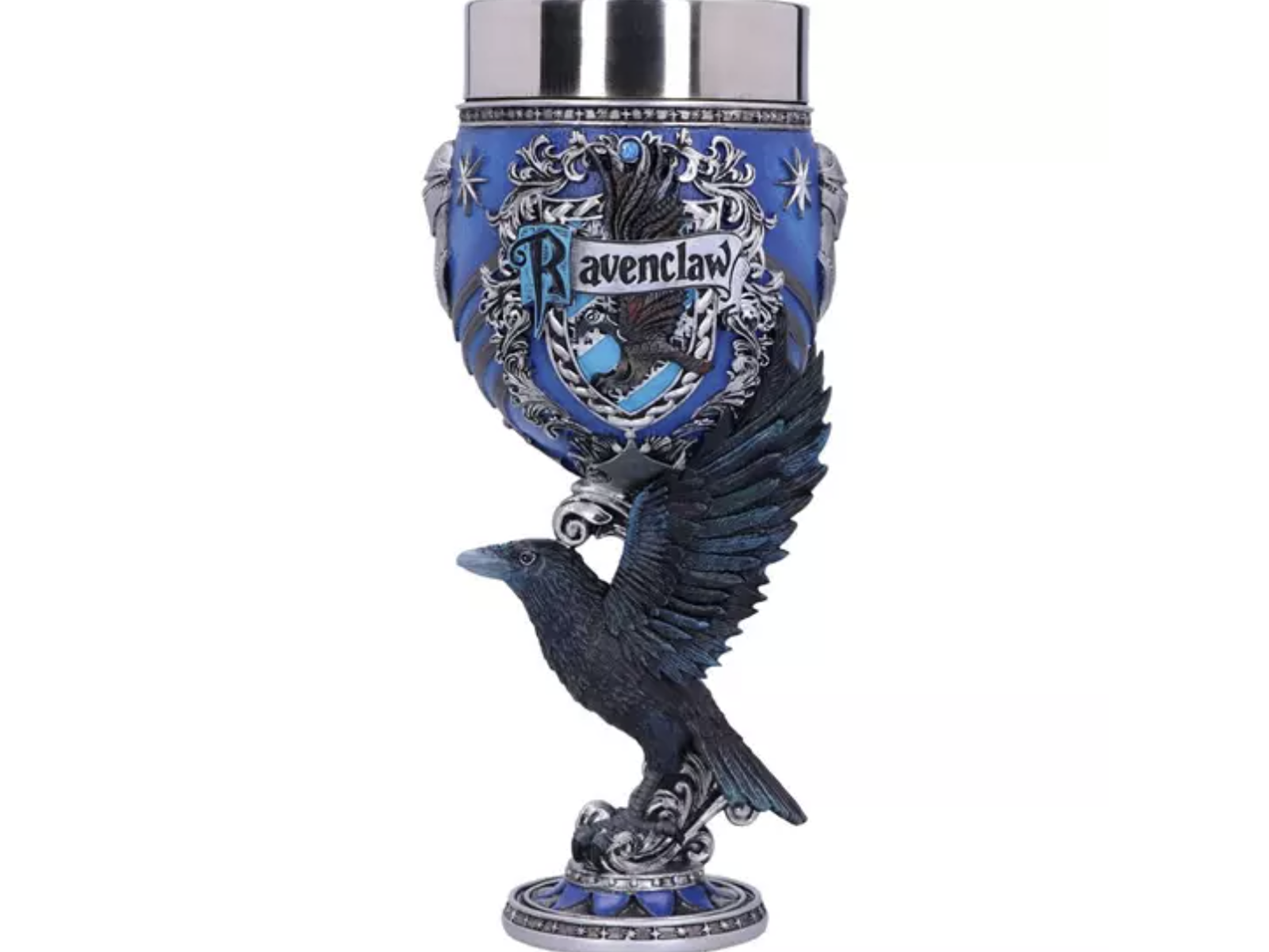 Overdådigt bæger som næsten kun kan være Rowena Ravenclaws sande arvinger værdigt! Denne officielt Harry Potter-licenserede goblet med Ravenclaw udsmykning er produceret af Nemesis Now, og der er virkelig kælet for detaljerne! Bægeret er modelleret med Ravenclaws våbenskjold på forsiden og håndmalet i klare og farvestrålende blå nuancer i Ravenclaws ånd. Langs stilken af bægeret troner en majestætisk ravn , med vingerne slået ud. Bagsiden af bægeret er prydet med et ravnehoved i profil!