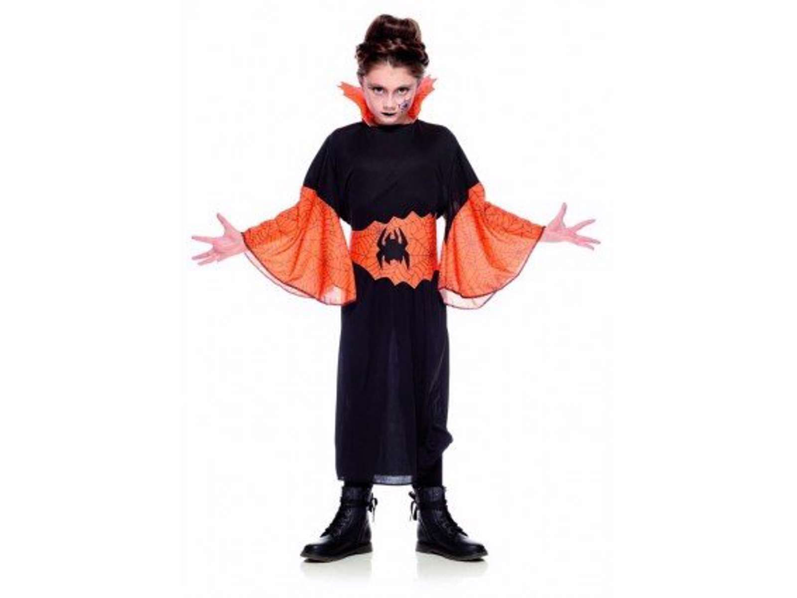 Spiderella kostume til børn 7-9 år. Edderkoppernes dronning kostumet indeholder kjole med krave og bælte.