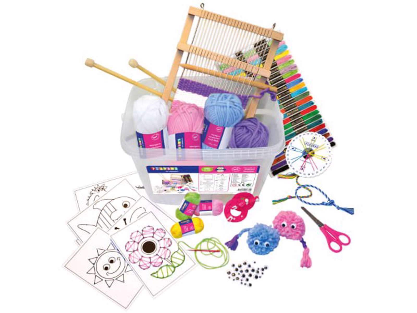 Hobbykasse med væv, strikkepinde, sakse, garn og meget mere. I alt 75 dele i en praktisk plastkasse.    Anbefalet alder fra 5 år.