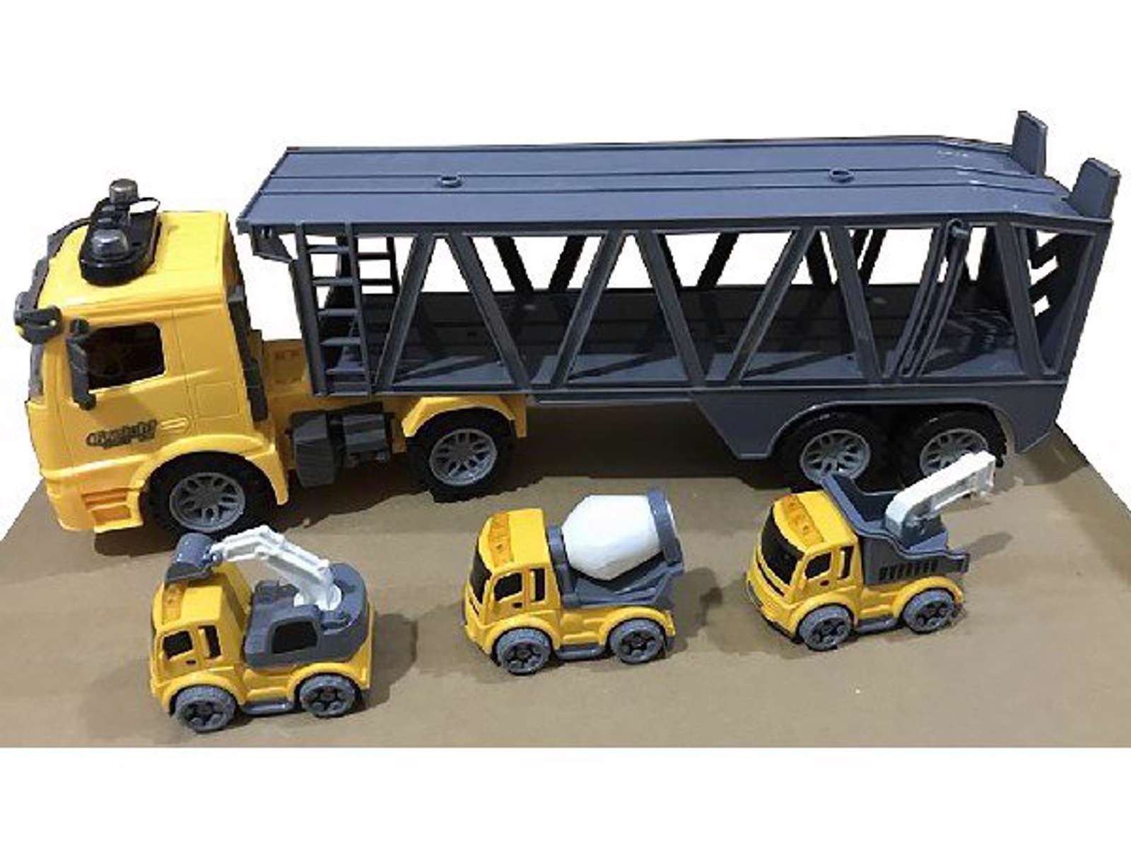 Lastbilen med autotransporter og 3 mindre køretøjer. Lastbilen har lys og lyd.