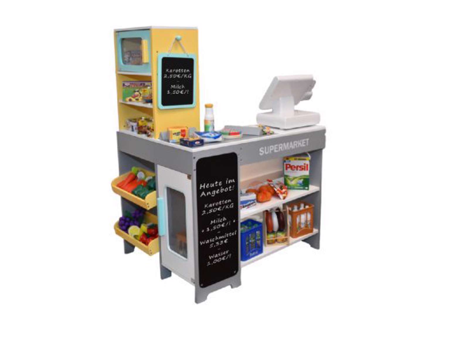 Supermarked i træ incl tavle og 40 varer