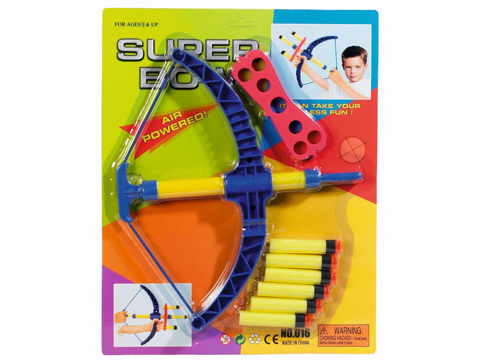 En armbrøst der indeholder 6stk skumpile. På bagsiden af blisteren er der skydeskive.