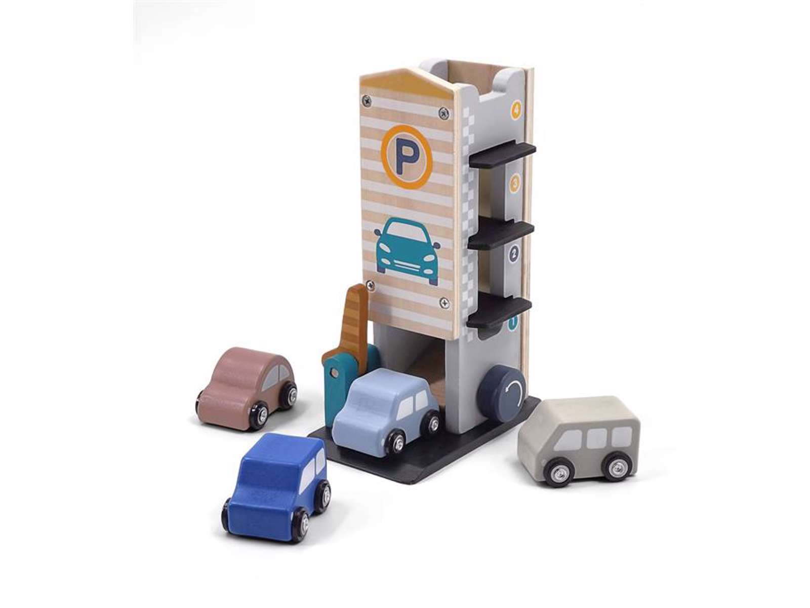 Sjovt bil parkeringshus med fire tilhørende biler i 100 % FSC træ fra Magni