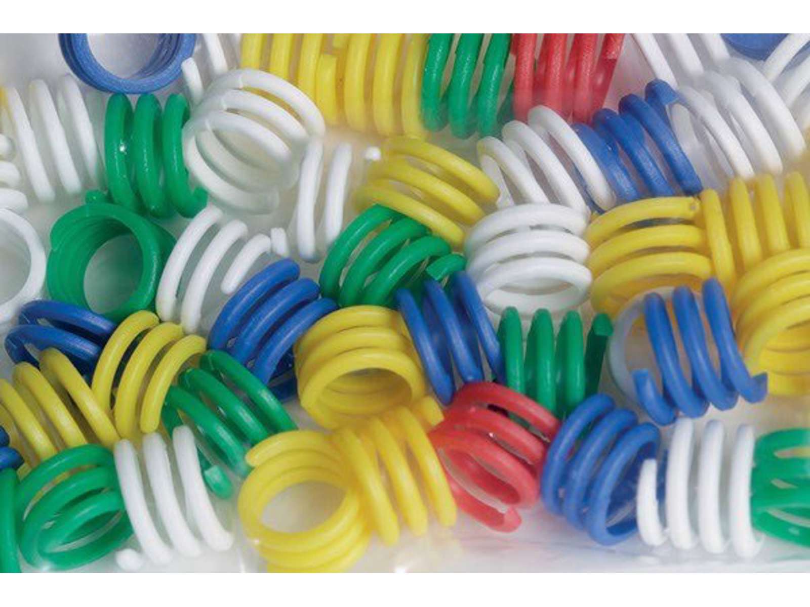 Spiral ring af plast, som ringene kan sættes sammen til en kæde, pose med forskellige farver. Posen indeholder 50 dueringe.