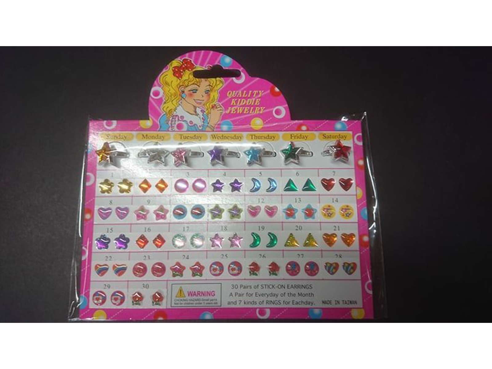 Sjovt juvelsæt med 7 forskelligt farvede ringe og 30 sæt klister-på ørenringe. Hav et nyt sæt på hver ugedag. Ringene er af plastik og har begrænset levetid.