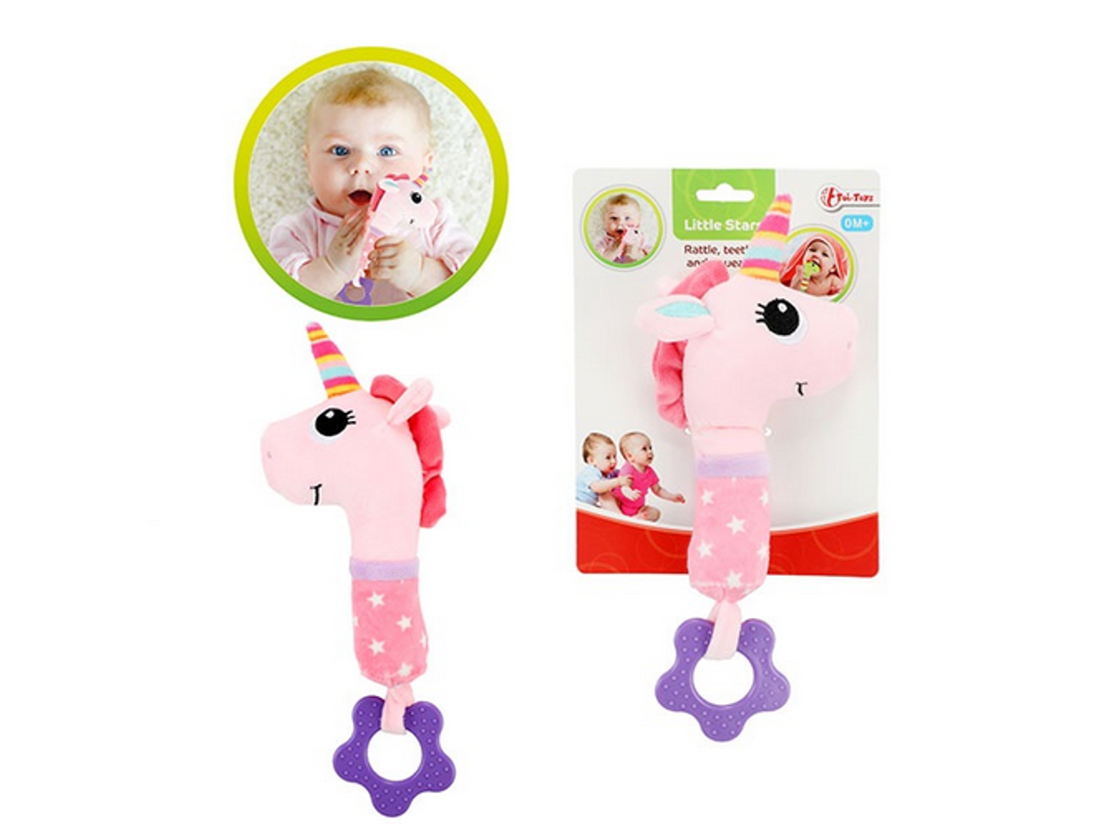 Dette er et baby multi værktøj, det er en enhjørning som både har rangle, bidering og er blød så man kan klemme den.
