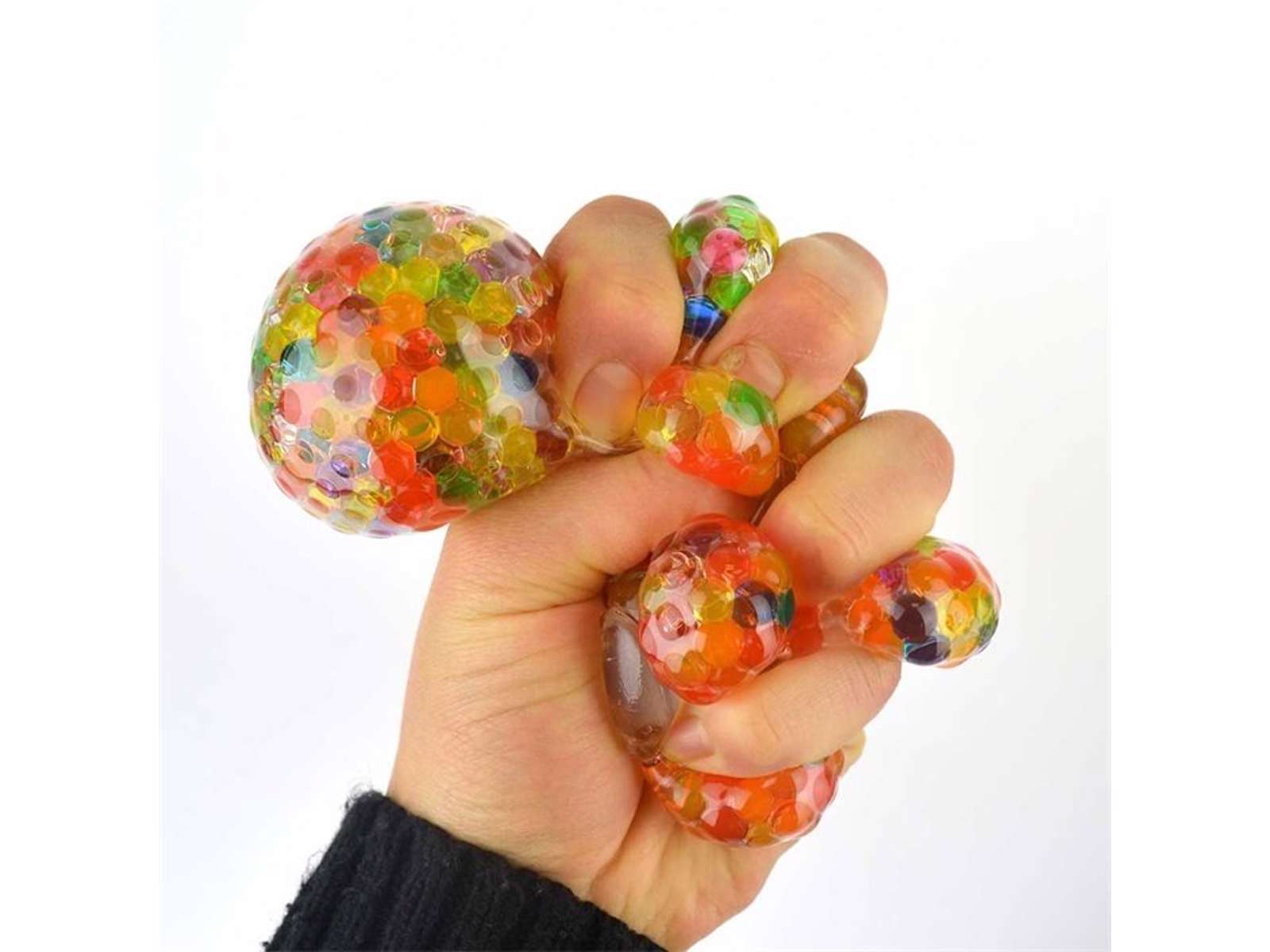 Vildt sjovt bold fyldt med små farvede vandperler. Du kan både klemme den mangefarvede stressbold og bruge den til at kaste til hinanden. Den måler 7 cm.