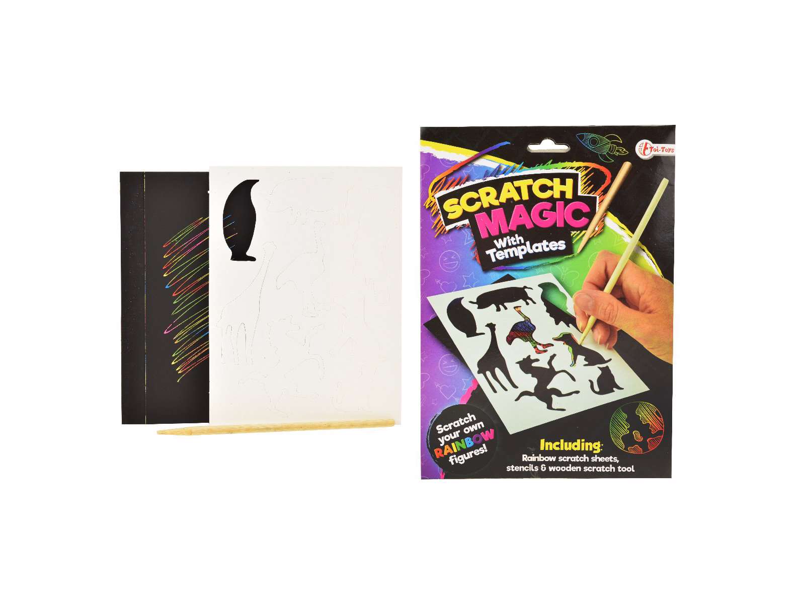 Kommer med 2 ark papir, 2 ark skabeloner og 1 træpind.