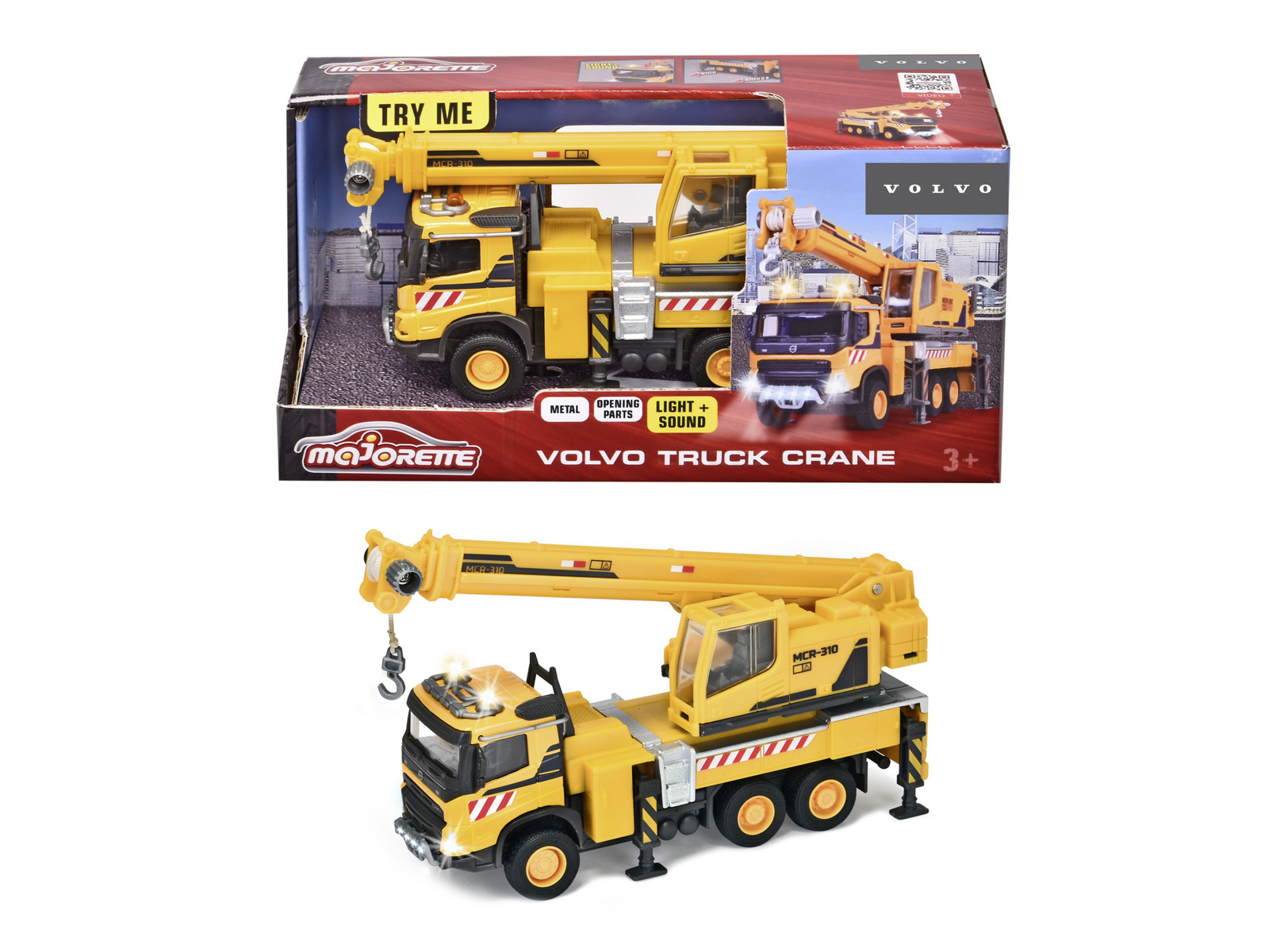 Majorette Volvokran-lastbil med lyd- og lysfunktioner, justerbar kran (35cm), spil, krog, 4 bevægelige støttearme, gummidæk. Længde 22 cm. Inkluderer 2 x AAA batterier. Fra 3 år.