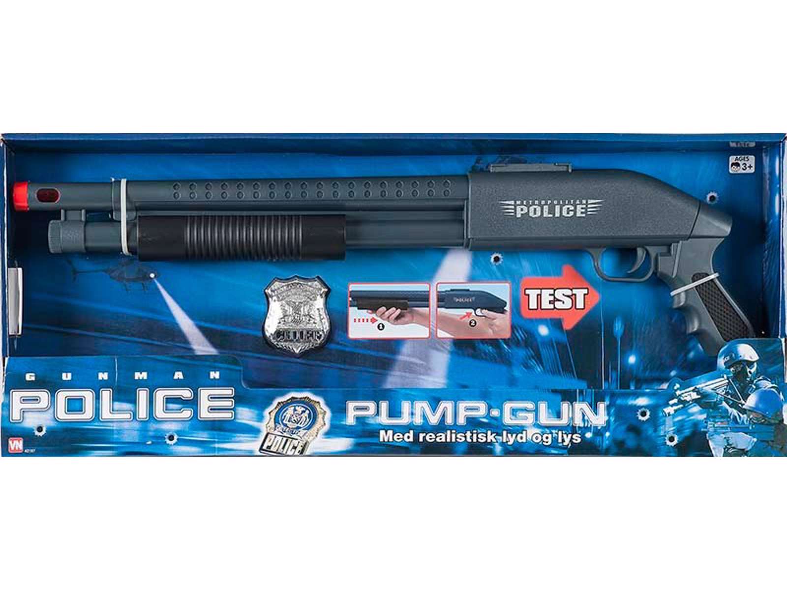 Sej politi pumpgun med lys. Den måler 54 cm og kommer også med et politiskilt.