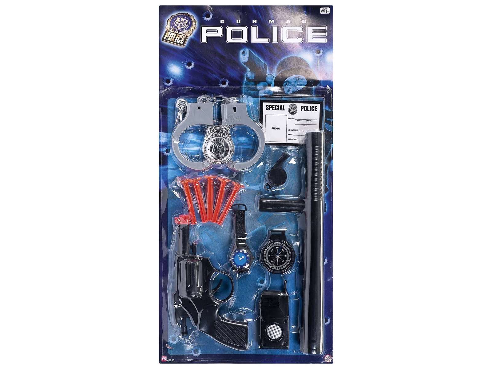Stort politisæt med pistol der kan skyde med bløde pile, politistav, fløjte, skilt, id, kompas, ur og walkie talkie.