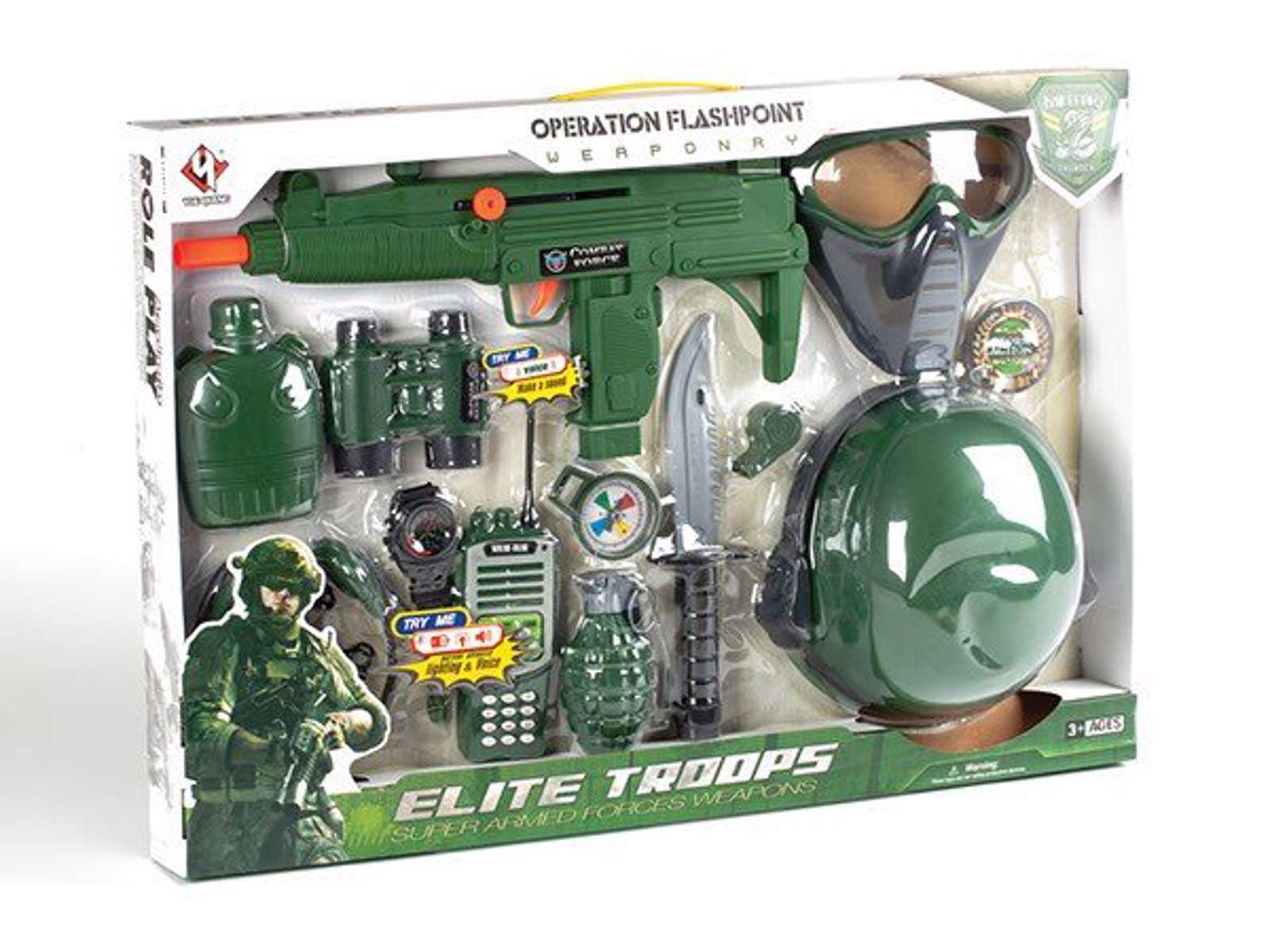 Dette militærsæt sæt indeholder både maskingevær med lyd, feltflaske,kikkert, ur, headset, håndgranat, kompas, kniv, hjelm, maske og en walkie talkie som kan sige lyde og lyse.