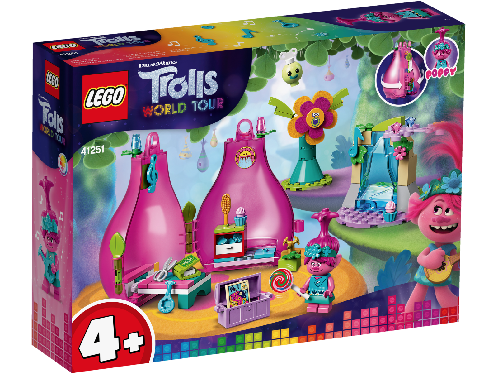 Børn, der elsker filmlegetøj med Poppy og Trolls, vil være vilde med LEGO® Trolls World Tour sættet Poppys kapsel. Der er masser at opdage, når din lille Trolls-fan slutter sig til Poppy i starten af hendes rejse. Børn kan hjælpe Poppy med at tage et brusebad, sætte hendes hår og lede efter skattekortet. Med masser af fantasifuld leg er dette LEGO 4+-sæt en sjov måde for de yngste at lære at bygge på. Sjov på farten – Trolls-legehus og minifigur af trolden Poppy Poppys kapsel kan foldes ud og lukkes til et transportabelt rejselegetøj for at holde de små underholdt, uanset hvor turen går hen, hvilket gør det til en fantastisk gaveidé til børn, som elsker legetøj i lommestørrelse. Samlerlegetøj til Trolls-fans LEGO Trolls World Tour legetøj, der er nyt i januar 2020, åbner en verden af kreativ leg for fans af Trolls-filmene. Børn vil elske at bygge de søde legetøjssæt, inden de genskaber deres yndlingsmusikscener fra historien.