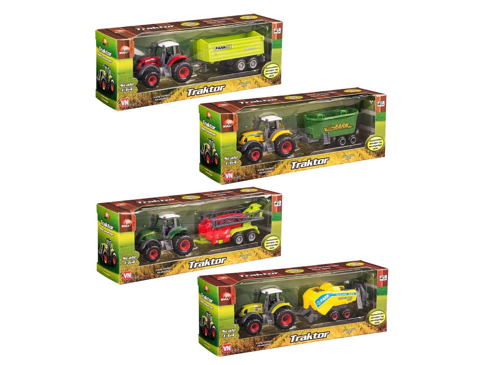 Vælg mellem forskellige varianter af denne traktor, der hver kommer med, hver sin farve og anhænger. Skriv en kommentar til din bestilling, hvis du gerne vil have en specifik traktor.