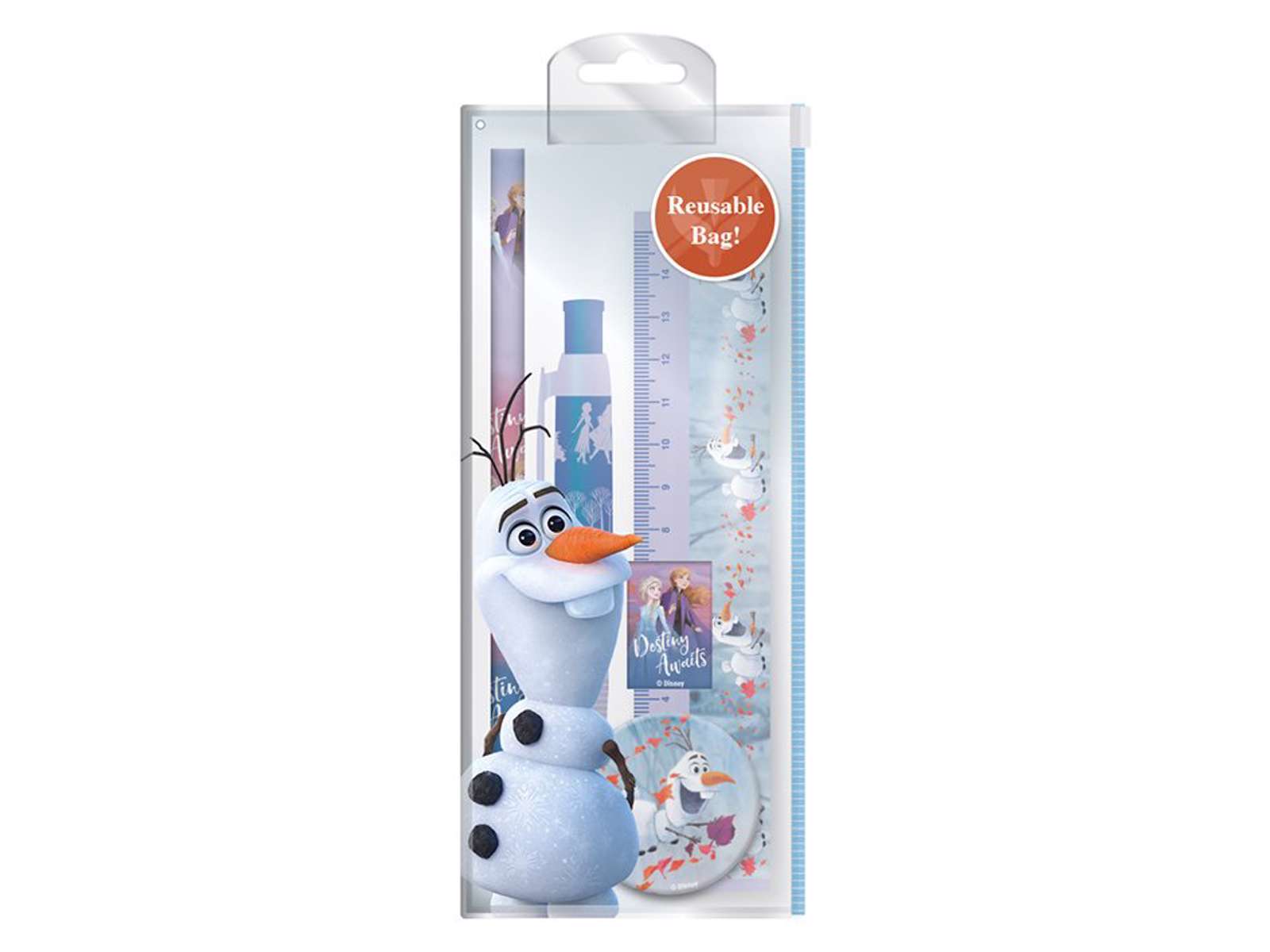 Frost 2 skrivesæt med blyant, lineal, kuglepen, blyantspidser og viskelæder.