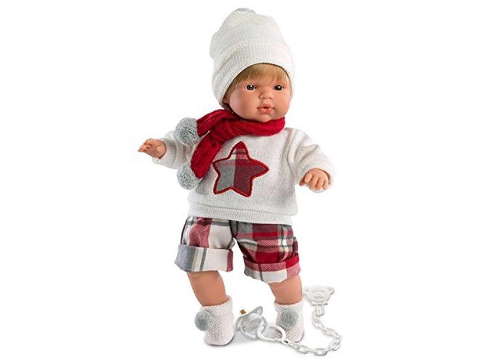 Sød lyshåret, blød drengedukke fra Llorens. Han måler 38 cm og kommer i skotskternede bukser med hvid sweater, hue og tørklæde med kvaster. Dukkerne er 100% spansk designede og 100% håndlavede, og i dag kendt over hele verden for deres fremragende kvalitet kombineret med et udsøgt design. Hos Llorens anvender man kun 1 klasses materialer gennem hele fabrikationsprocessen.