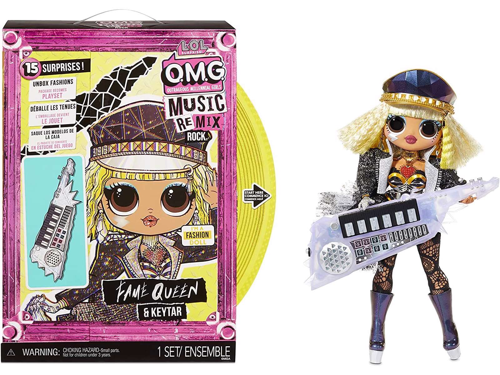 Pak de nye L.O.L. Surprise OMG Remix Rock fashiondukker op og bliv overrasket igen og igen! Remix Rock dukkerne er smukke, har flot hår og deres egen fabelagtige stil. Hver dukke spiller med i bandet Super Sonix, og du får helt sikkert lyst til at samle dem alle fire! Mød Fame Queen som spiller keytar: hun har sin helt egen skandaløse rock-stil!