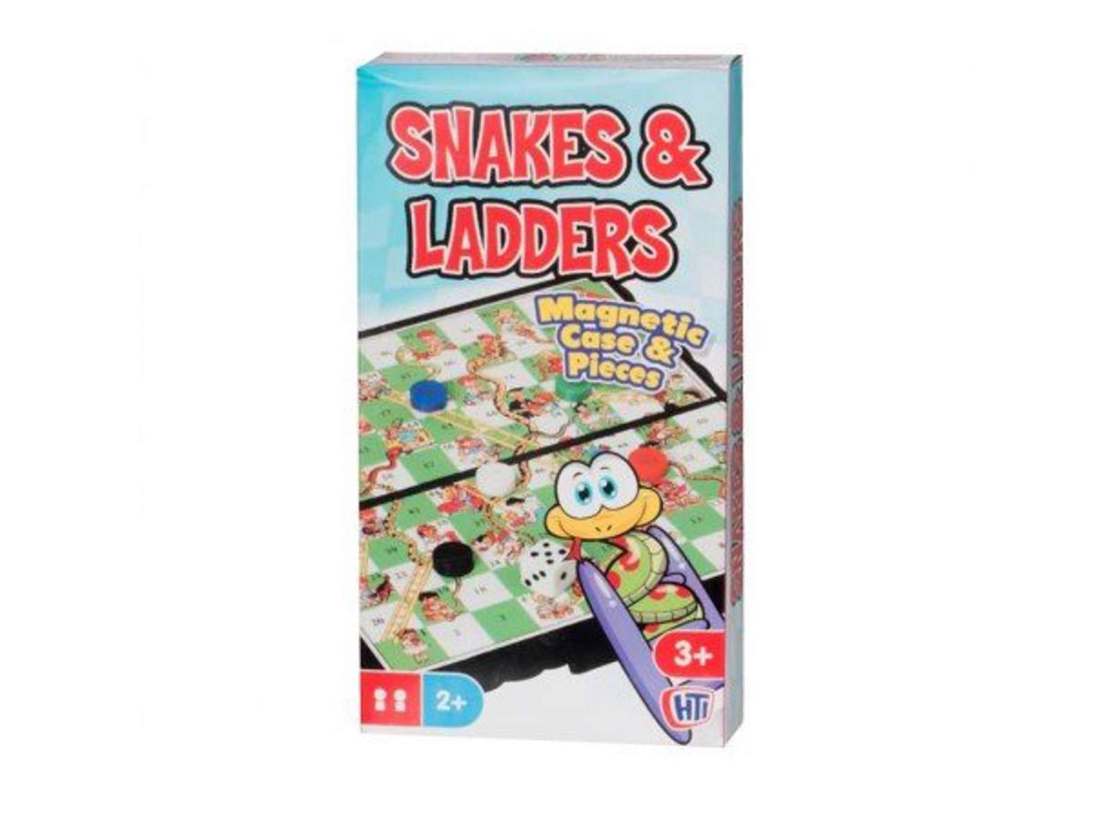 Dette magnetiske Slanger og stiger spil måler 14 x 14 cm når det er slået op, og kun 14 x 7,5 cm når det er slået sammen.