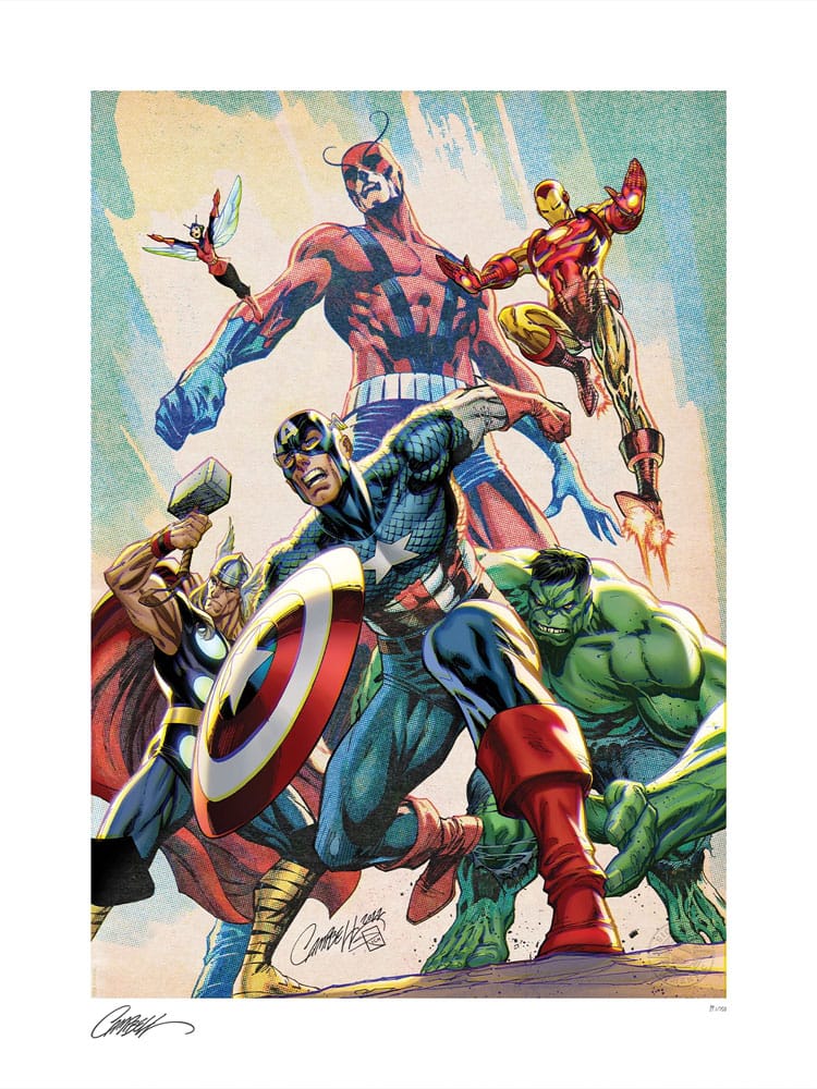 Sideshow Art Prints presents The Avengers Fine Art Print by artist J. Scott Campbell with colors by Sabine Rich, celebrating the retro roster and classic costumes of this iconic Marvel Comics team. Legends leap off the comic book page and into your collection in this exciting illustration by fan-favorite artist J. Scott Campbell. On a day unlike any other, the Avengers first assembled to stop the threats they couldn't face alone. This colorful composition features Thor, the Wasp, Giant-Man, Captain America, Iron Man, and the Hulk in one of the earliest outings for the super hero team-up. Shields, stingers, repulsors, hammers, and fists are raised and ready to tackle any nefarious villains who dare to challenge these mighty Marvel heroes. Originally created as a variant cover for Avengers Assemble: Alpha #1 (2022), written by Jason Aaron for Marvel Comics, this comic book artwork is now available for fans in a fine art format. Each The Avengers Fine Art Print is hand-signed by J. Scott Campbell and features an embossed Sideshow Seal of Authenticity as a part of the limited edition of only 150 pieces. The print is available as an unframed giclée or in a custom framed presentation, ready for display in any Marvel wall art collection. Assemble the action for yourself and bring home The Avengers Fine Art Print by J. Scott Campbell today! Print details: - Officially licensed by Marvel - Limited edition of 150 - 46 x 61 cm fine art giclée print - 100% cotton rag, acid free, certified archival matte Epson Cold Press Natural, 305GSM - Epson archival inks - Embossed seal of authenticity