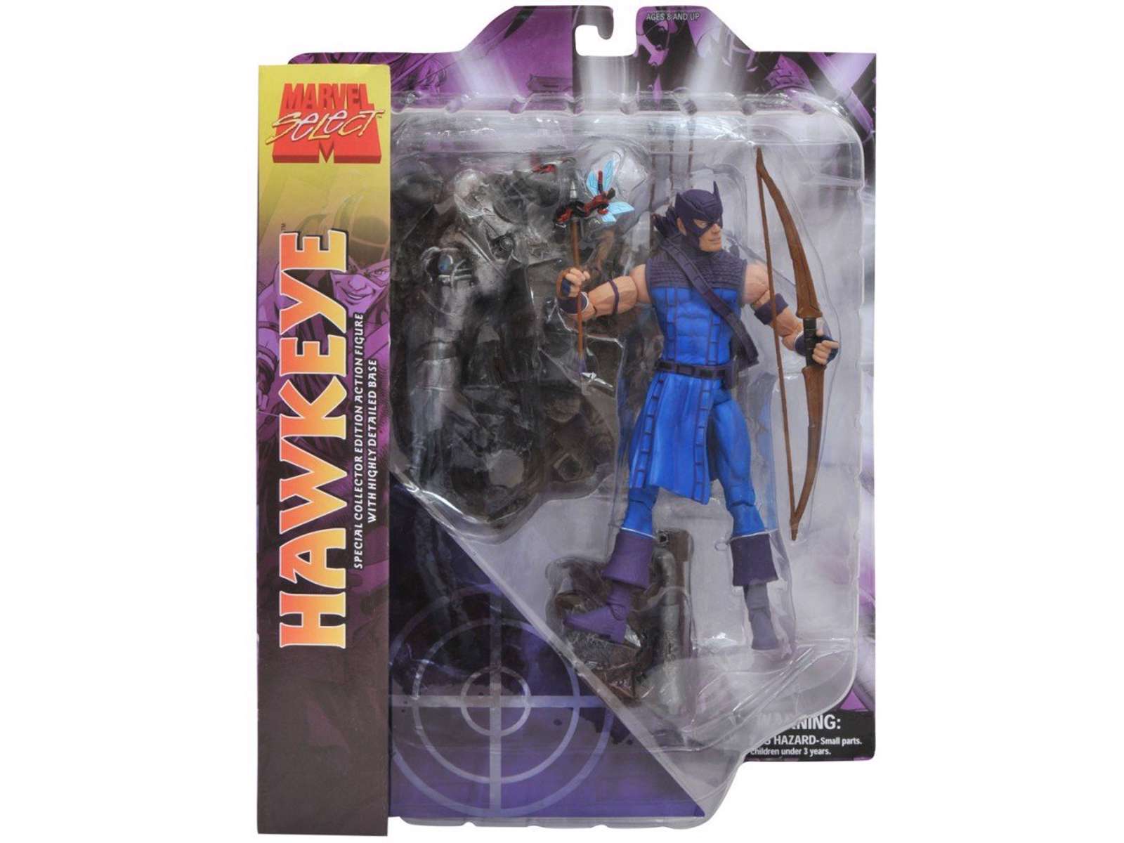Marvel Select laver flotte figurer fra Marvels forunderlige univers. De måler alle ca. 20 cm. og er lavet af plast. Figurerne kommer med en base, så de kan stå og er således perfekte til at udstille. Dette er Hawkeye fra Avengers med en lille The Wasp på den ene pil.