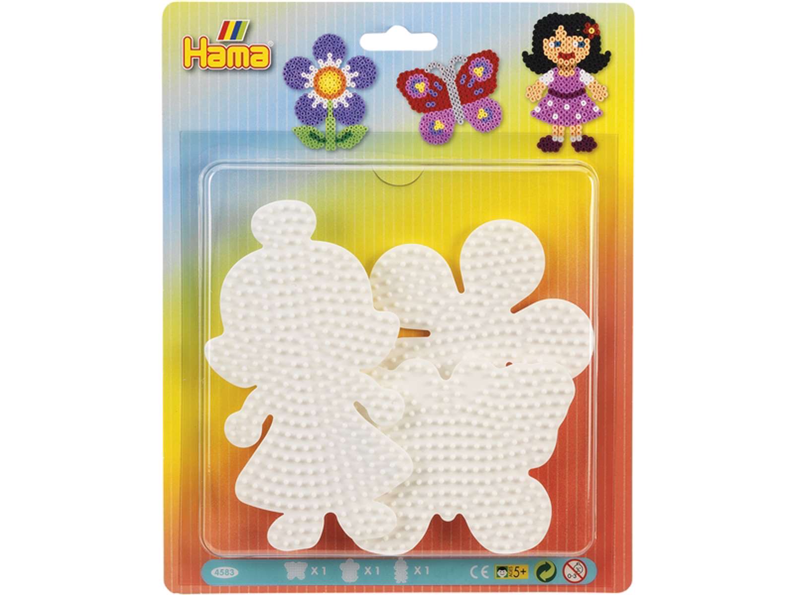 Pakken indeholder 3 perleplader: 1 pige, 1 sommerfugl og 1 blomst.