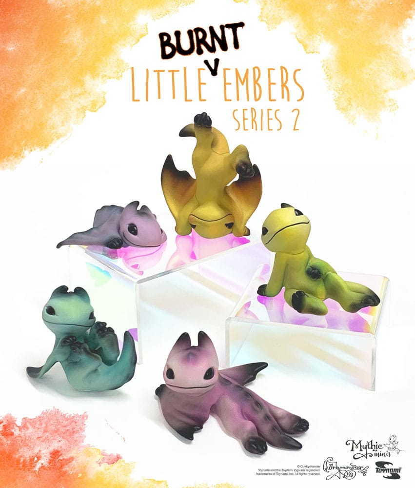 The Little Burnt Embers Series 2 Blind Box Figurines feature dark, "sooty" color variation. Figures are approximately 3" tall and come case packed 15 units per tray. Each tray will include three units of each style: