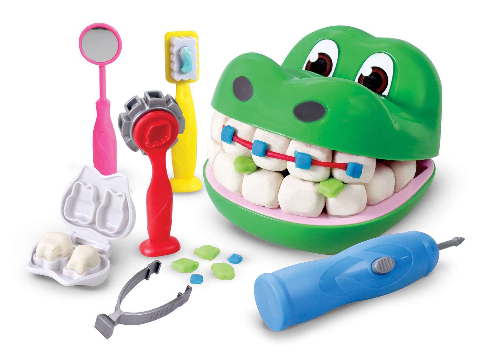 Krokodillen skal til tandlægen og det er her barnets opgave, ved brug af redskaberne og modellervoksen, at lave krokodillen huller i tænderne eller måske trække dem helt ud.