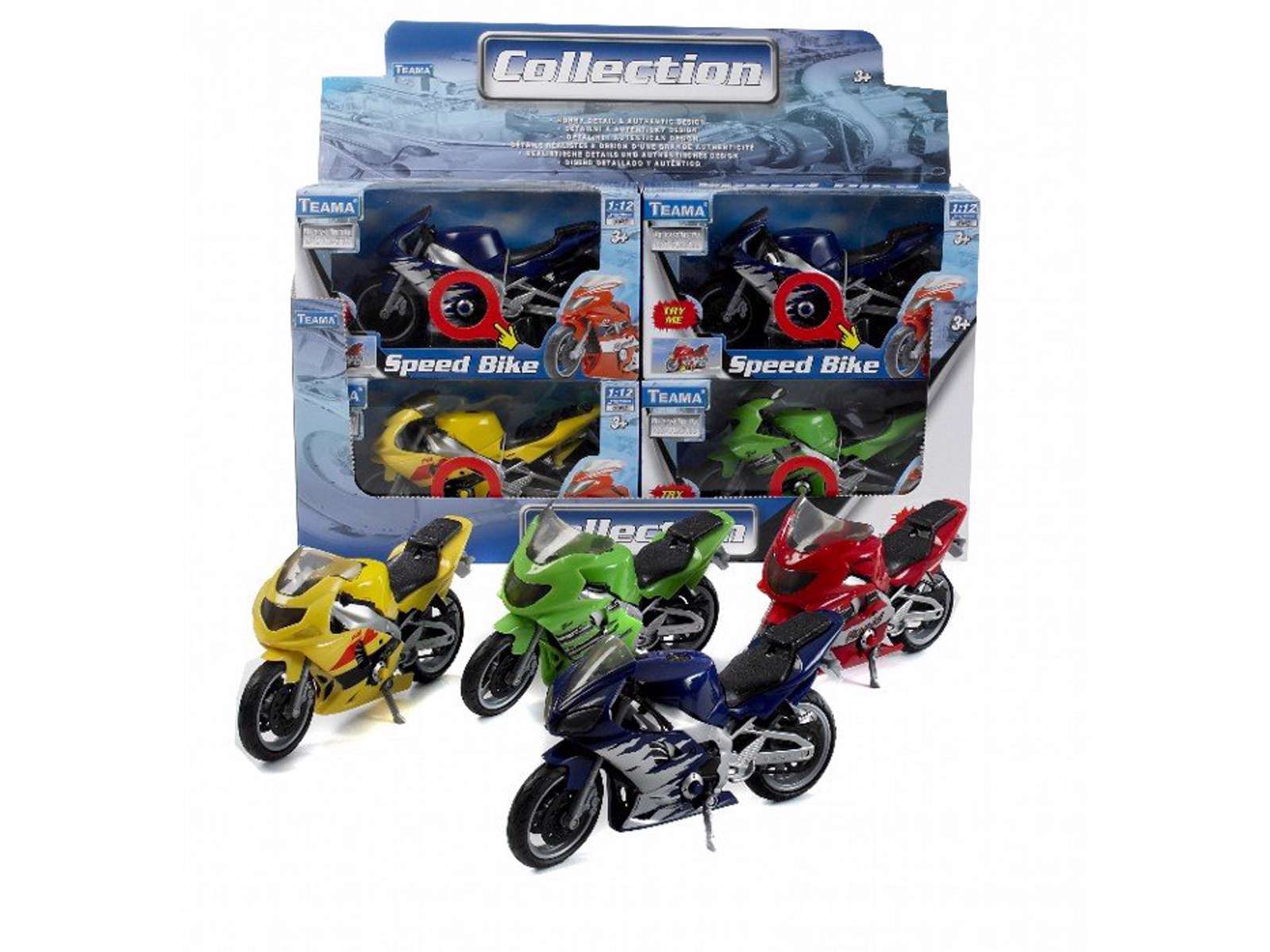 Fin motorcykel af metal og plastik dele i størrelsesforholdet 1:12. Motorcyklen siger lyd når du trykker på den. Motorcyklen fås i fire forskellige farver.