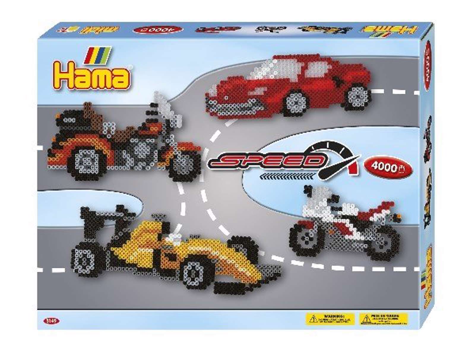 Lav seje biler og motorcykler i Hama perler. Sættet kommer med cirka 4.000 perler, 2 store firkantede stiftplader, motivark, vejledning og strygepapir.