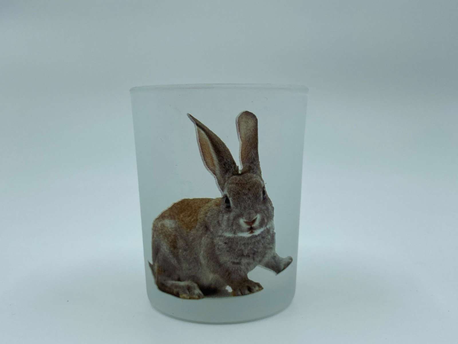 Sød lille fyrfadsstage med en lille nuttet påskehare. Den er lavet i glas og er 6,5 cm høj.