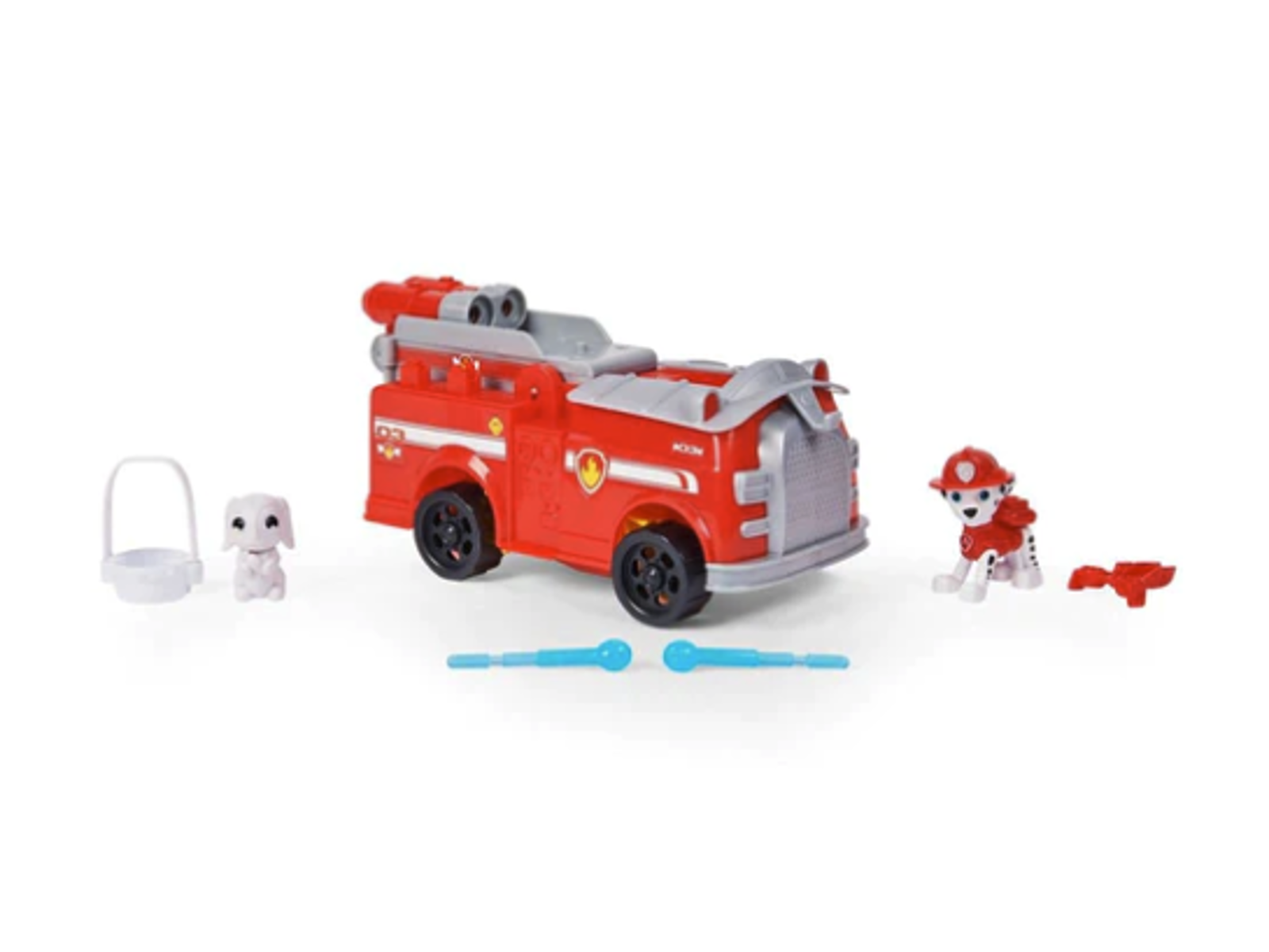 Køretøjet er fyldt med seje funktioner: Hvis man trykker på knappen, hæver brandbilen sig samtidig med at stigen folder sig ud, og så har stigen endda en vandkanon for enden! Når bilen hæver sig, åbner den også op for et hemmelig rum, hvor man kan gemme tilbehøret i. Marshall kan sidde oppe i bilen og holde øje med det hele, og han kan sende den seje drone ud for at redde kaninen. Dronen kan sættes fast på den medfølgende kurv, så kaninen kan blive reddet ned fra høje, farlige steder!