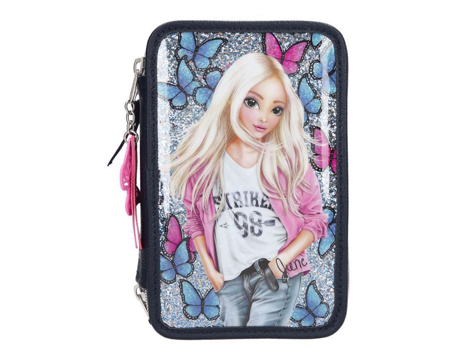 Stort og lækkert penalhus i tre lag fra Top Model Butterfly-serien med modellen June og sommerfugletema på forsiderne. Der medfølger indhold i de tre rum: Saks, limstift viskelæder, blyantspidser, tuscher, farveblyanter og almindelige blyanter.