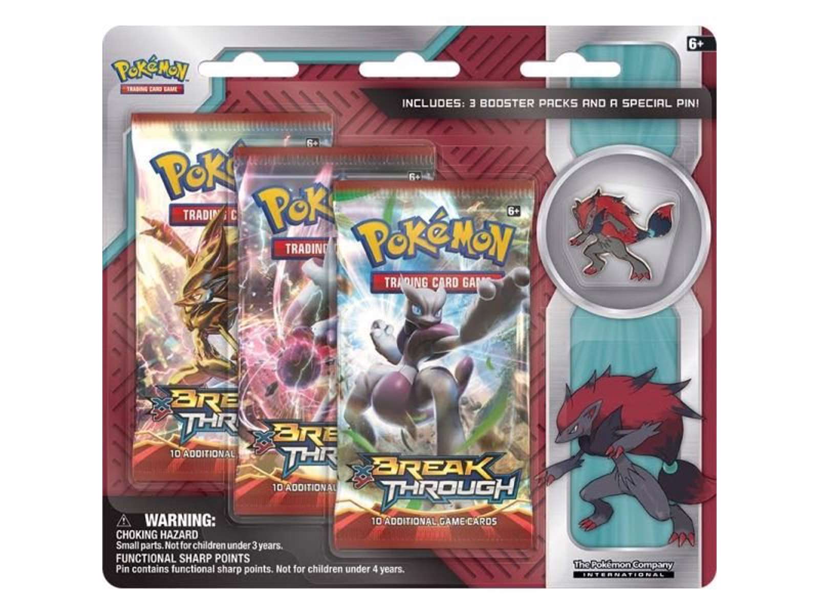 Pokémon sæt med 3 Break Through pakker. Sættet kommer også med en badge med Zoroark.