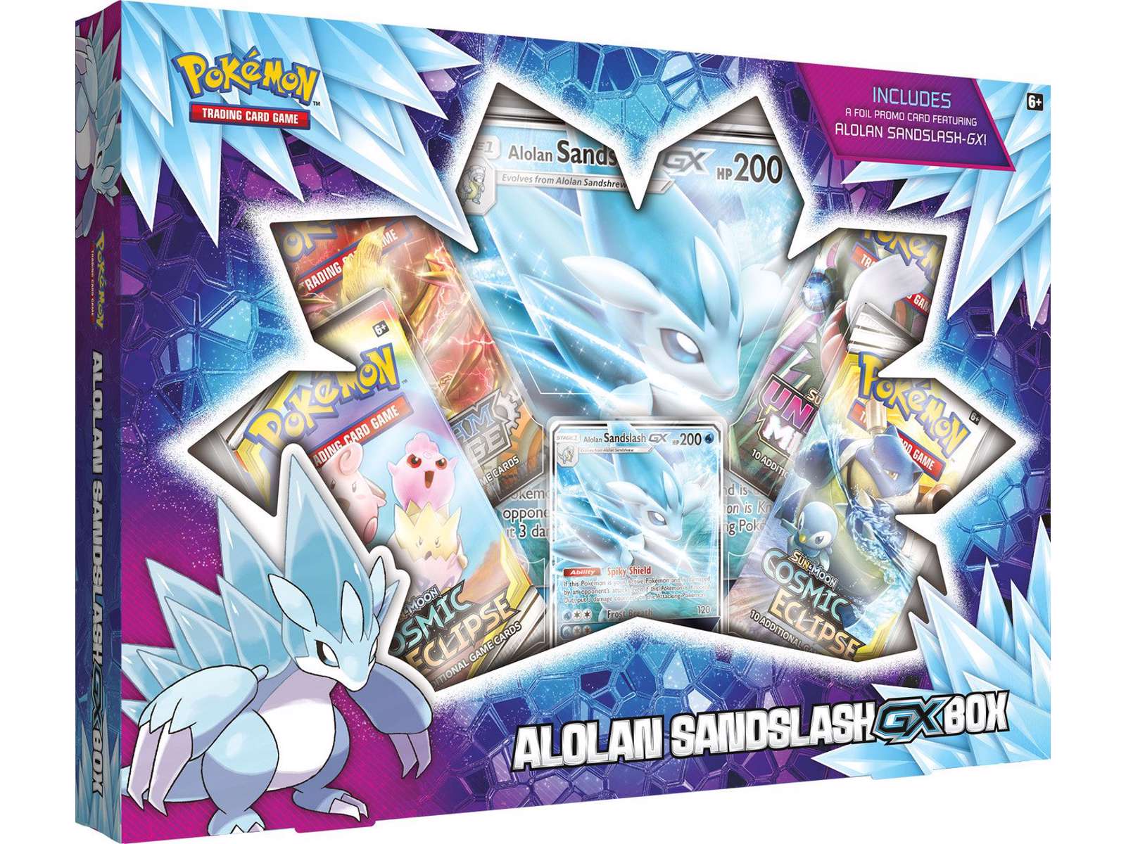 Sej Pokemon æske der indeholder: 4 blandede boosterpakker 1 Alolan Sandslash GX kort 1 stort Alolan Sandslash GX kort