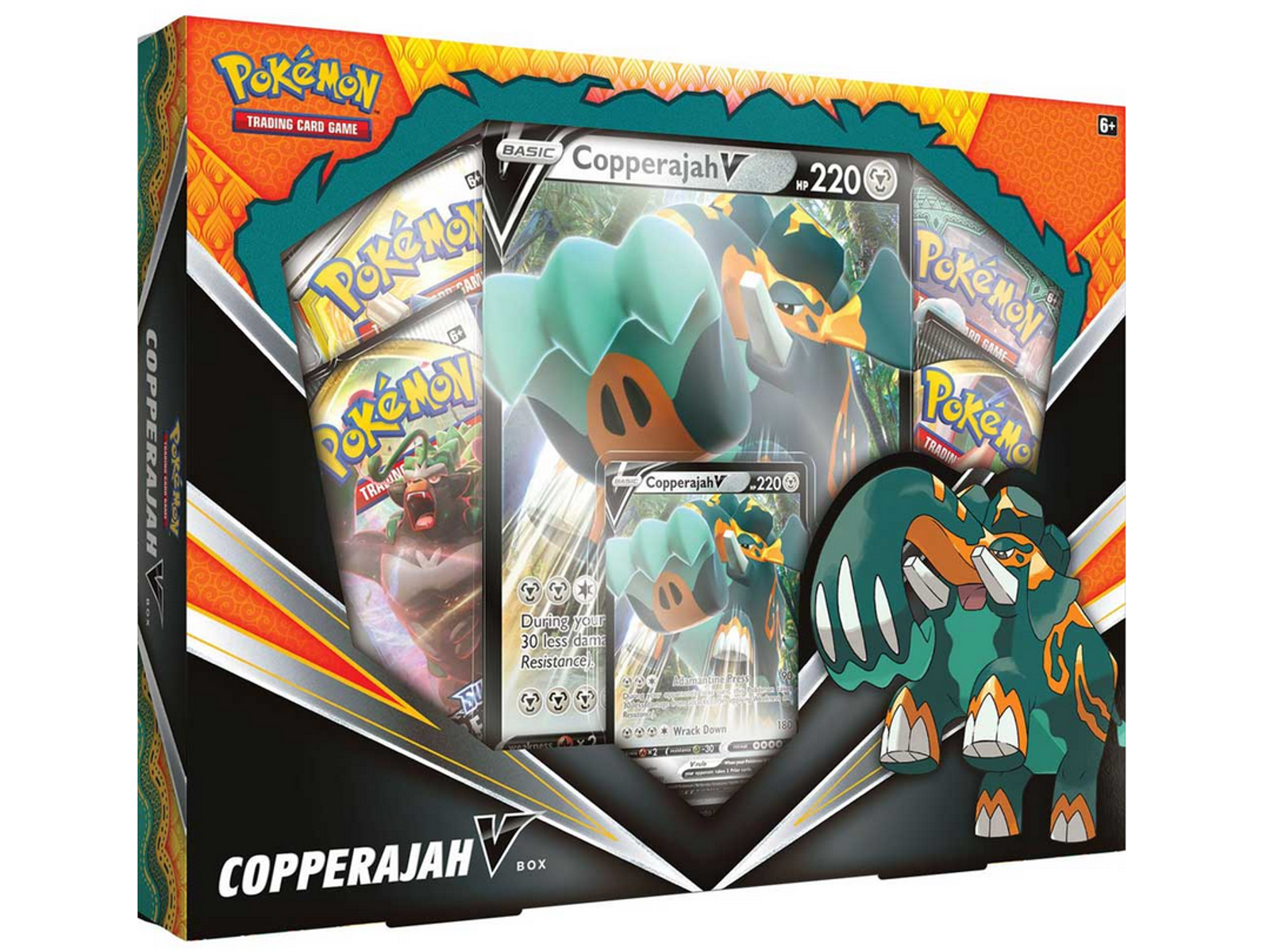 Boksen indeholder den større V-kortet på Copperajah, 1 mindre V-kortet på Copperajah og 4 booster pakker