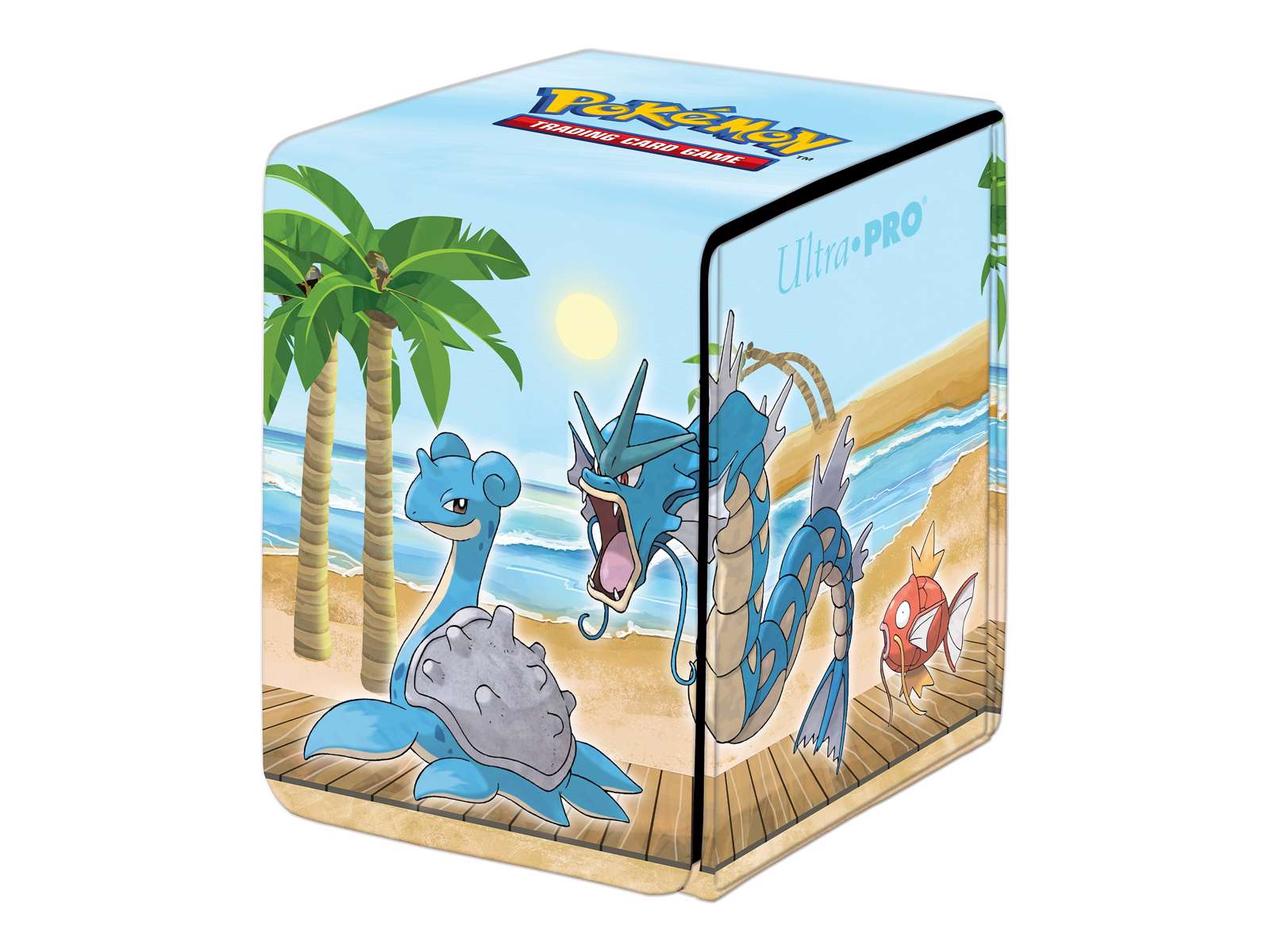 Kom i strandhumør med Pokémon Seaside Series tilbehør! Ultra PRO Alcove Flip Deck Box kan indeholde op til 100 dobbelt-sleeved kort og har flot artwork på ydersiden med Gyrados, Lapras, and Magikarp. Perfekt til opbevaring af dine Pokémon kort!