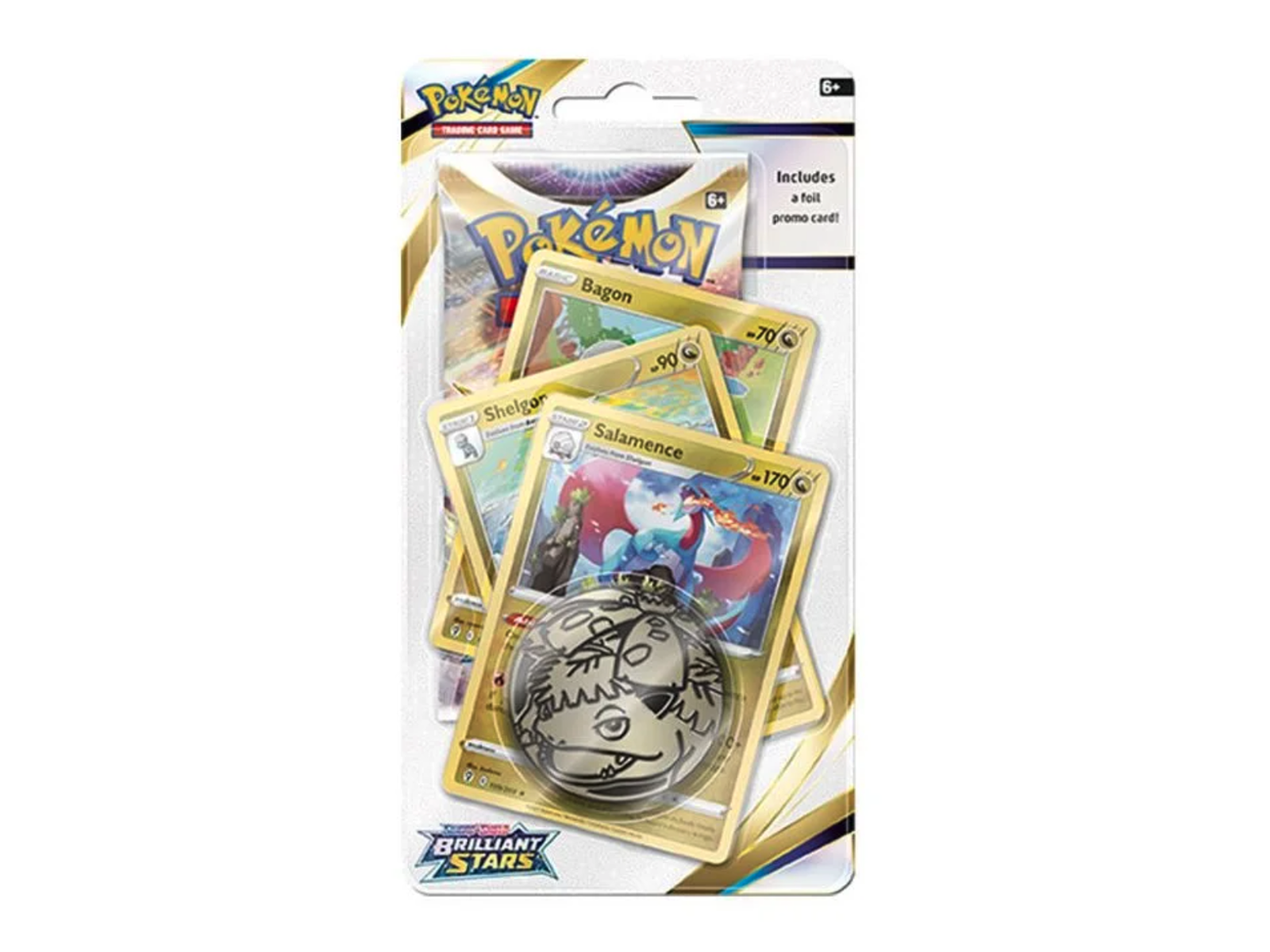 Her får du en Pokémon Sword & Shield Brilliant Stars Premium Checklane Blister! Det er en fed lille Pokémon pakke med en Pokémon Booster pakke, tre Promo Pokémon kort, som du kun kan få i denne Checklane blisterpakke, samt en Pokémon mønt.