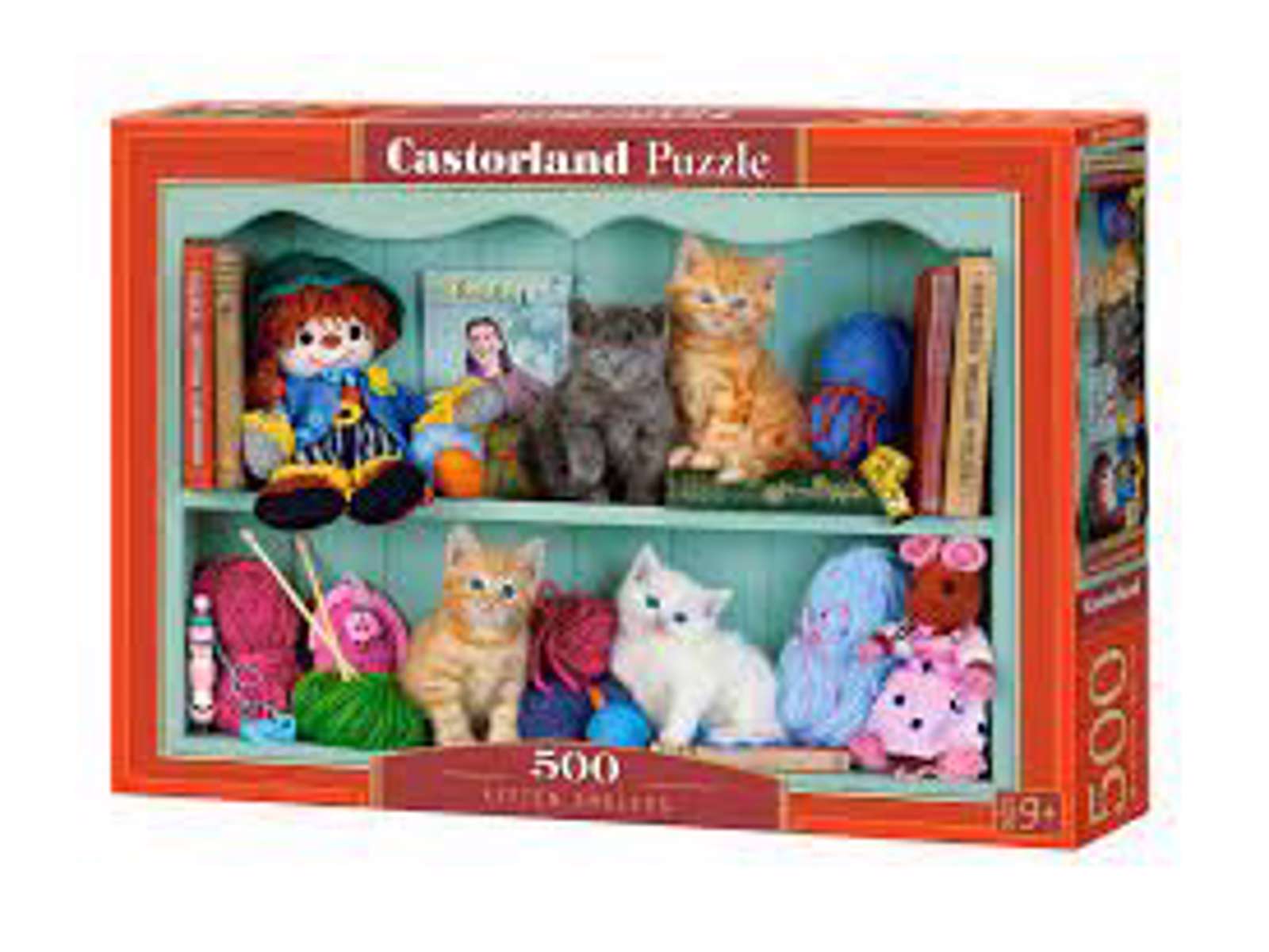 Farverigt og sødt puslespil på 500 brikker, med motivet af killinger mellem bøger og pynt i en bogreol.