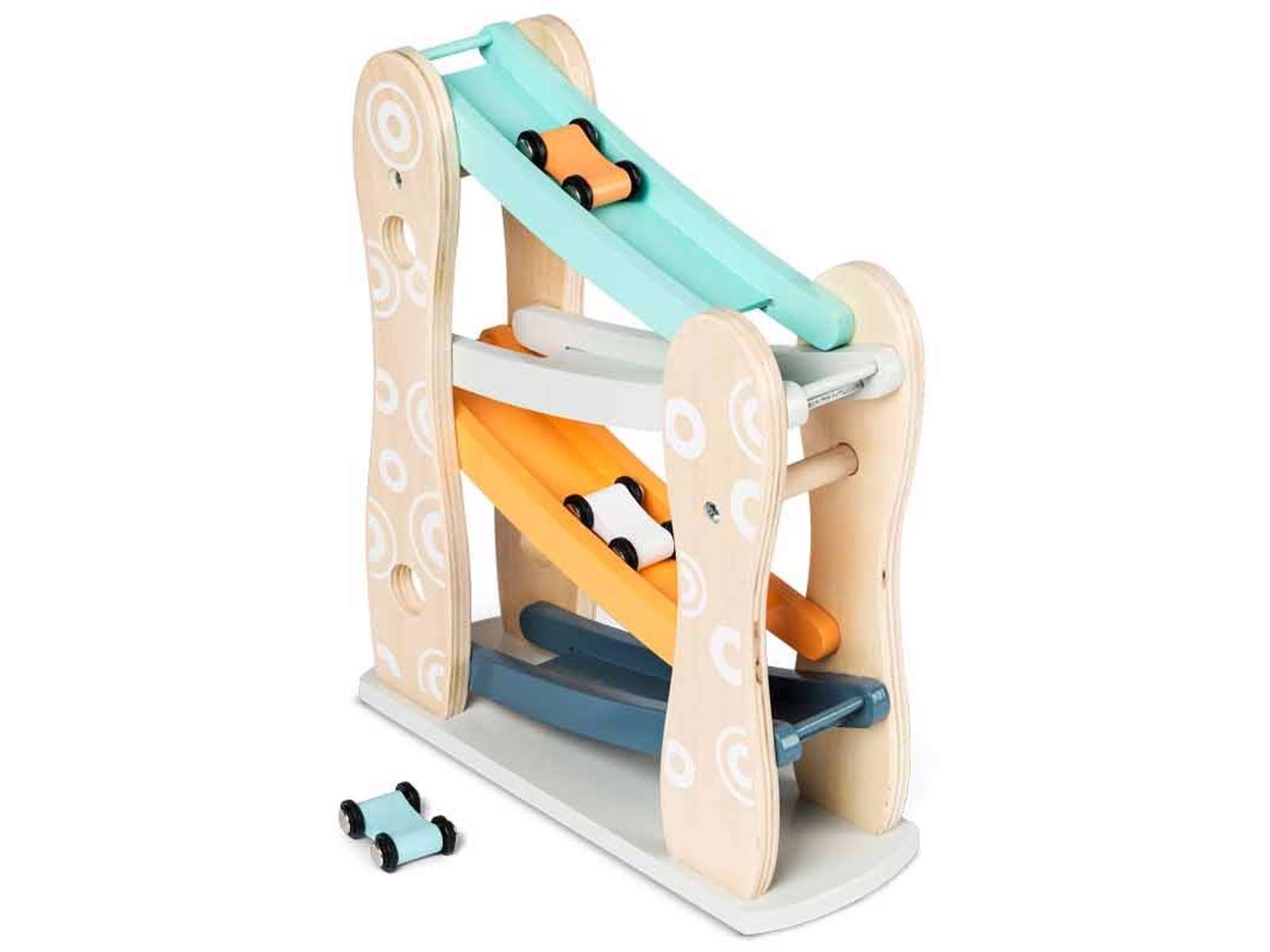 Sjov bilbane for børn som elsker biler og køretøjer. Barnet sætter bilen på toppen af banen og kan derefter følge den hele veje ned.