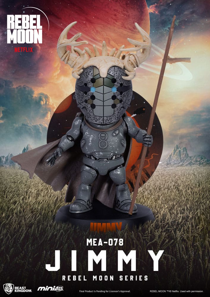 A once peaceful colony on the farthest edges of the galaxy is suddenly plunged into a life-threatening war they did not choose, from the tyrannical evil empire, "Barisalius" Facing imminent attack and annexation, a mysterious woman named Kora is determined to resist the brutal forces. Embarking on a quest to seek out warriors, she ends up recruiting a rag-tag team from neighboring planets, including outlaws, rebels, farmers, and war orphans, all united by the desire for revenge against the evil Barisalius. The stakes have never been higher as the pieces fall into place for an epic showdown unlike any other. To celebrate Zack Snyder's vision, Beast Kingdom is expanding into this new IP market with its classic 3-inch Mini Egg Attack series, launching a limited edition of collectible figures from the Netflix sci-fi film "Rebel Moon". This series features four core characters from the movie, each with unique accessories and costumes, bringing to miniature life the characters from the series in cute, mini statues while retaining their core design and character traits. Join these brave warriors in protecting the peace of the empire. Jimmy: Known as "C1435" during his time in the ancient knight robot army, "Robot Jimmy," as he is referred to while serving as a labor robot in the new empire's army, joins the resistance with intellect and wisdom. While on duty in Veldt, the imperial use of enslavement awakens an inner conflict, sparking his journey of self-discovery.
