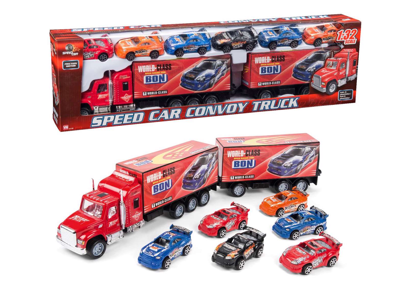 Flot rød lastbil med anhænger og 6 smarte racerbiler.