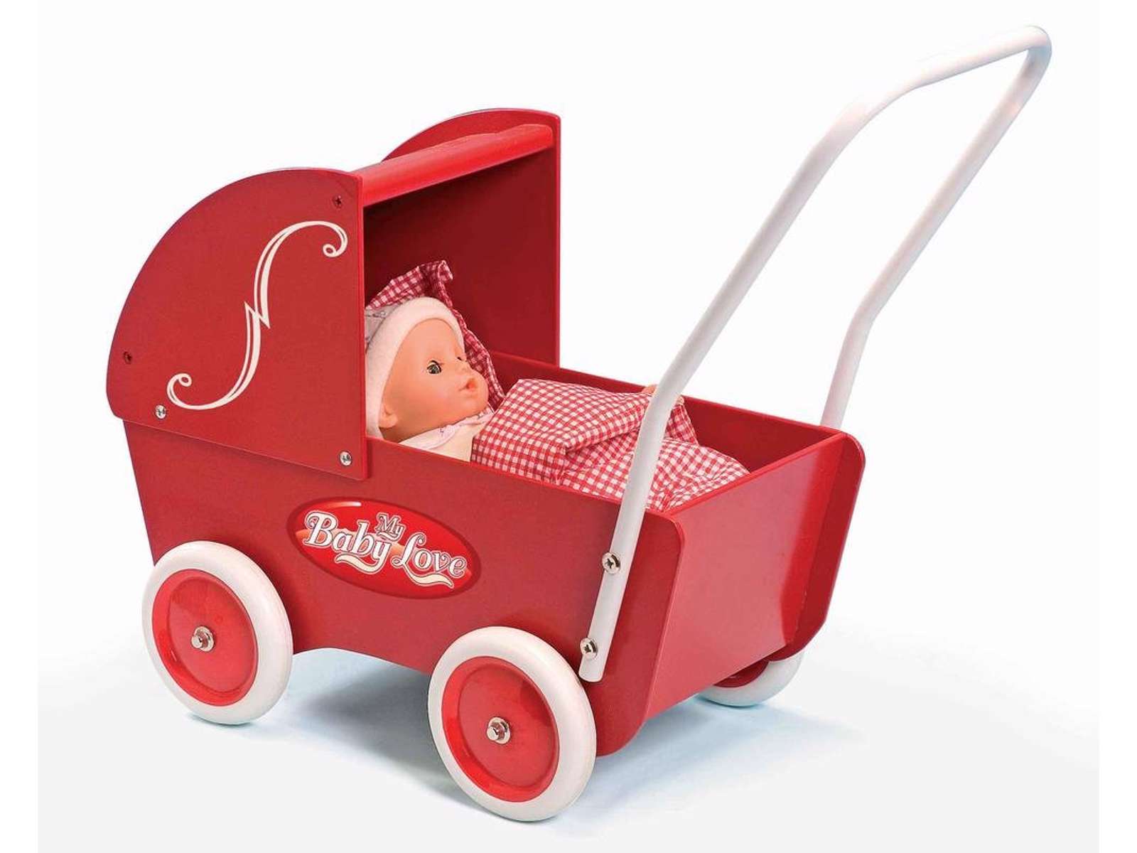 Fin klassisk dukkevogn i rød fra mærket My Baby Love. Oplagt til børn der lige er begyndt og gå og som synes det er hyggeligt at trille rundt med deres dukke eller bamse.