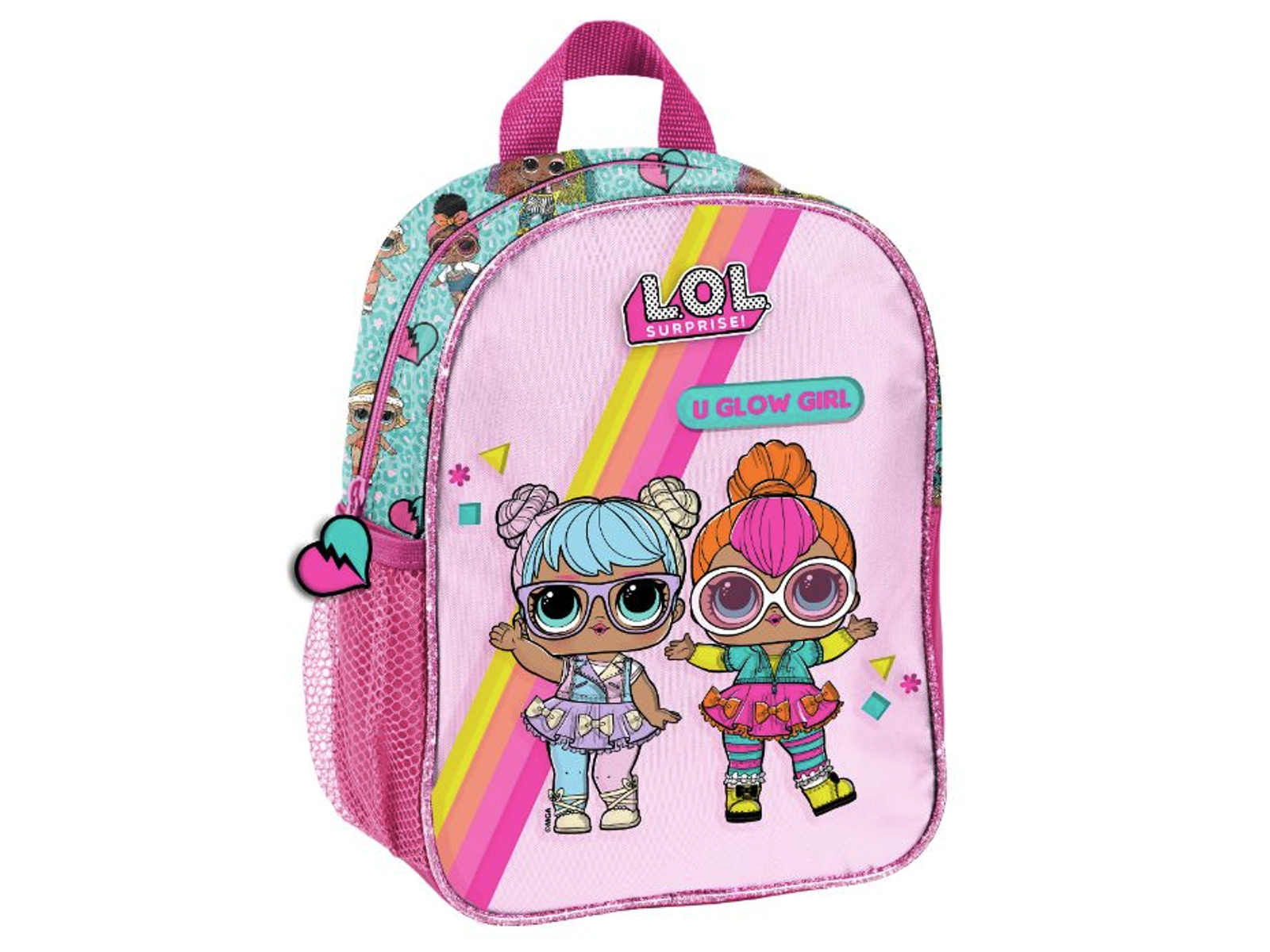 Denne L.O.L. rygsæk er en lille model med ét stort rum med lynlåslukning. Den har desuden en pink sidelomme i mesh til opbevaring af drikkedunken, samt regulerbare skulderstropper. På lynlåsene er fastgjort et taskevedhæng i form af et pink og turkis hjerte!