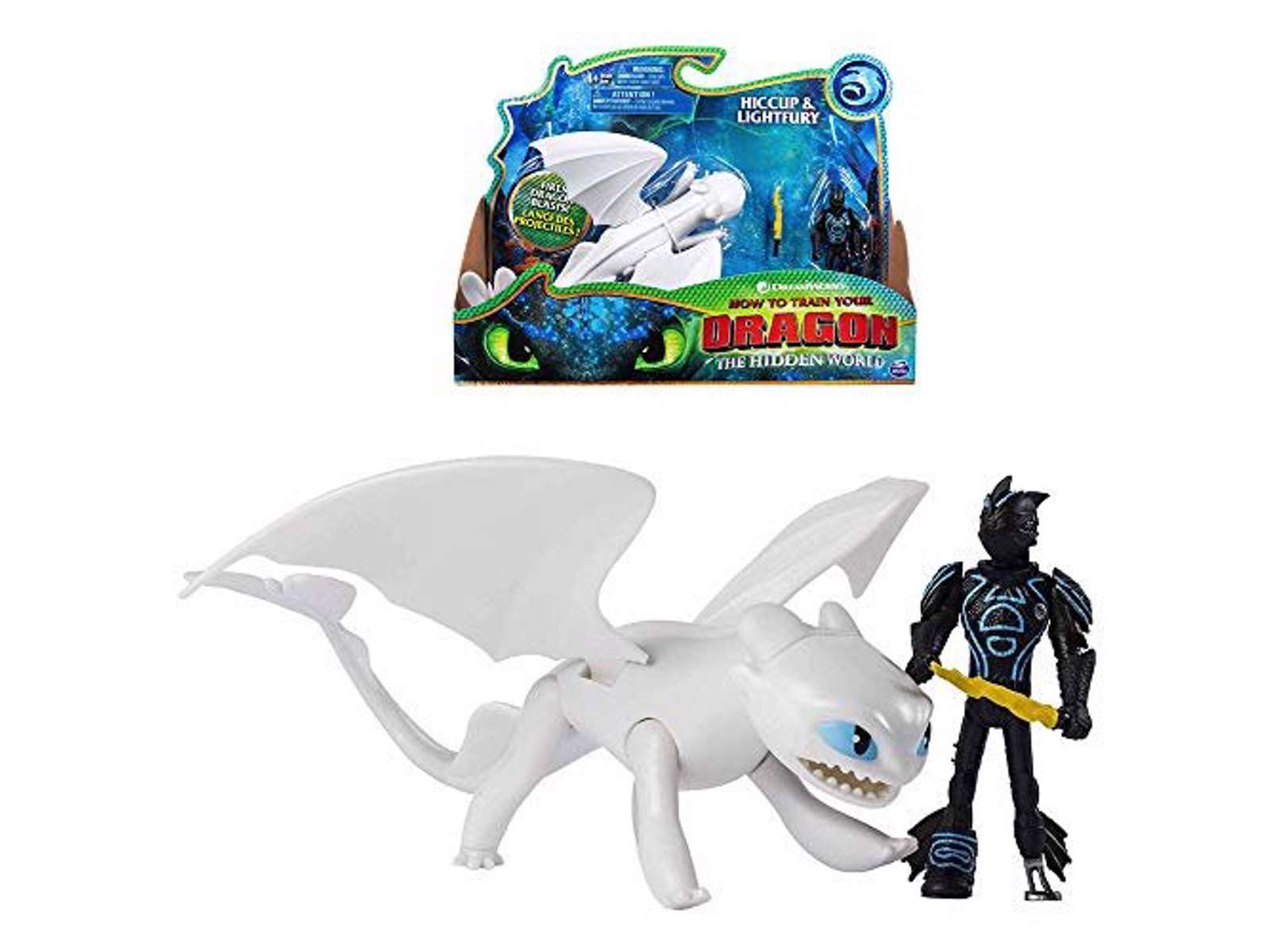 Figur fra Sådan træner du din drage filmene. Hikke på 9 cm og dragen Lysskygge (Lightfury) med et vingefang på ca. 22 cm.
