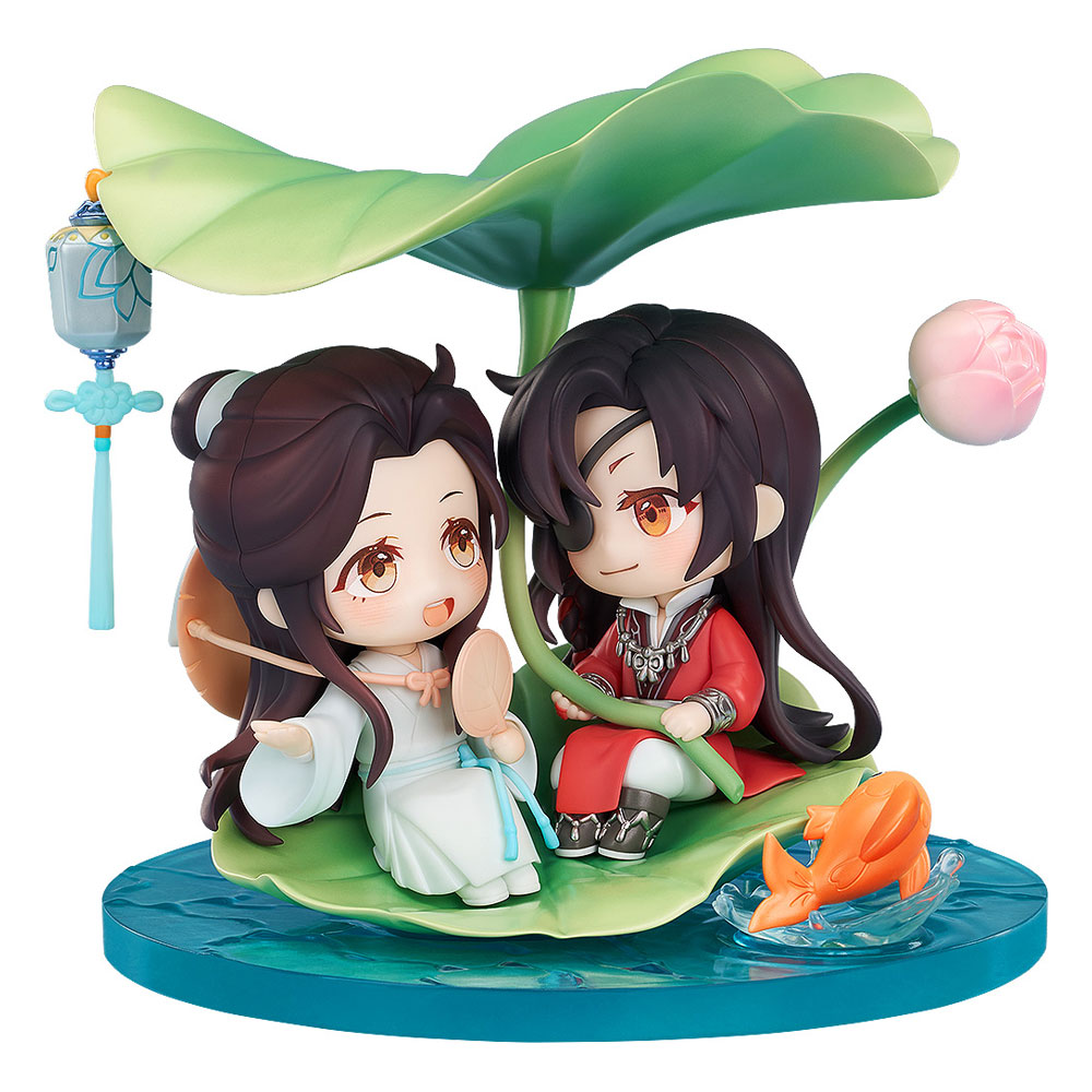 From the animated series "Heaven Official's Blessing" comes adorable chibi figures of Xie Lian and Hua Cheng! The two of them have been captured in figure form on a leaf boat beneath the shadow of a lotus plant out on a lotus pond with gentle blue waves. Xie Lian is using his fan to cool himself off while sitting on the lotus leaf, and Hua Cheng is holding up a lotus umbrella while gently gazing at the one by his side. The lamp hanging from their umbrella, glossy water droplet and carp leaping over the surface of the water all come together to create a scene of a beautiful night with a scent of lotus carried on the gentle breeze.
