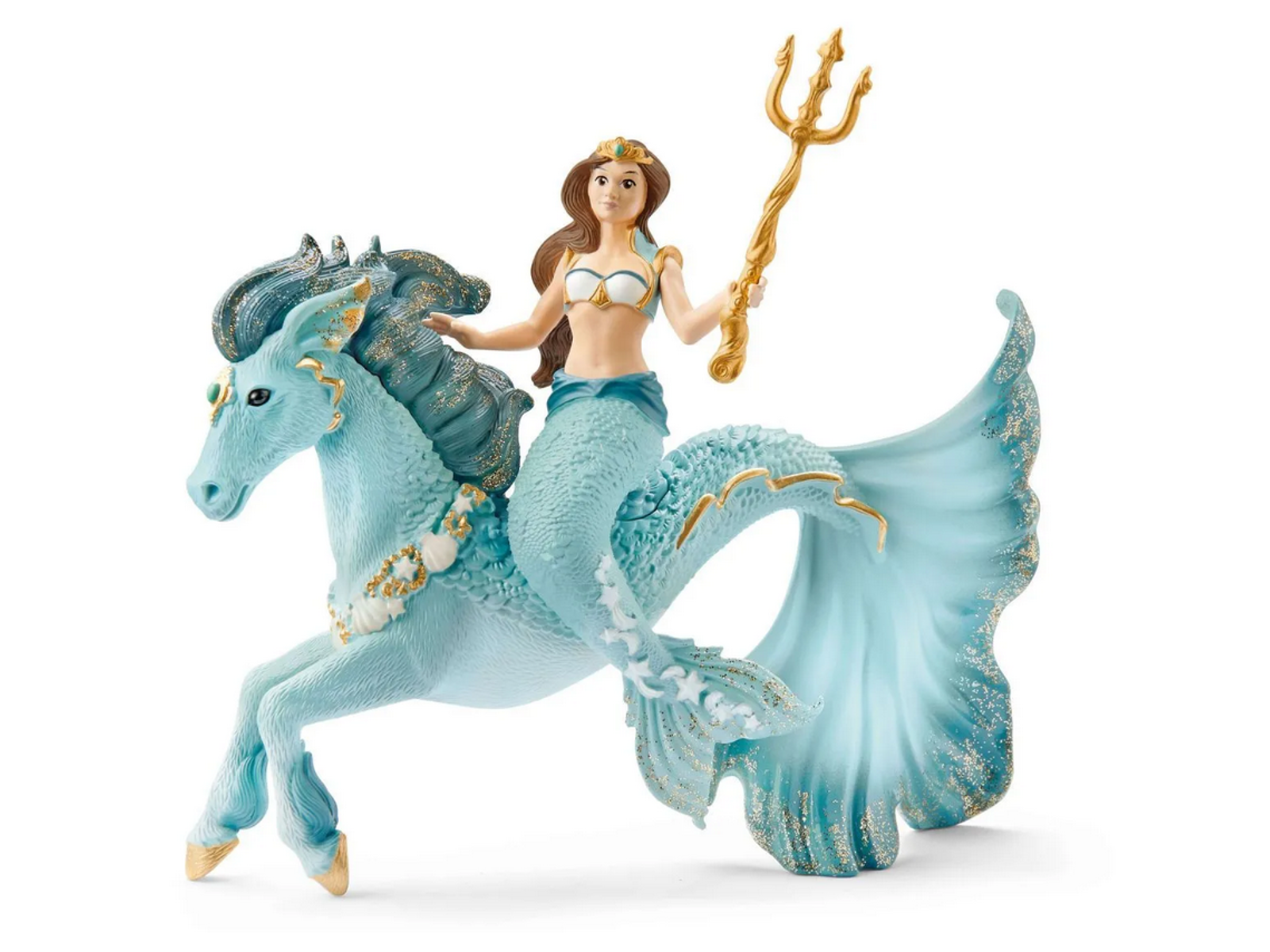Flot Schleich Bayala havfrue og undervands-hest* i turkis, med en medfølgende trefork i guld.